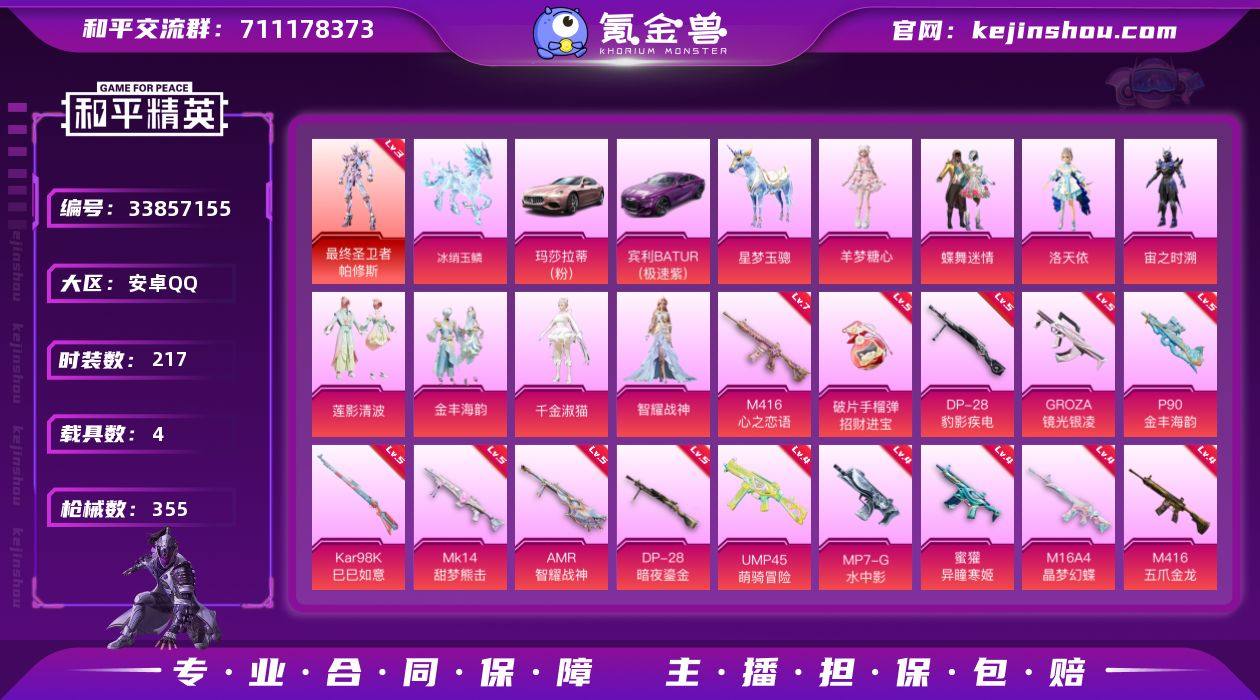 【LHPX2265】扭蛋碎片3261 【特价出售/店主推荐】安卓 手Q-1神装-8粉装-20特效枪-4载具-9粉色飞行器-113844热力值-19王牌印记-217套装-355枪皮【红色神装等级】:最终圣卫者-帕修斯(三级)【热门品类】:套装-浪漫天命,套装-小丑鱼,套装-龟仙人,套装-暗影哥特,角色-8号机,角色-Mark.06【粉色套装】:粉装-蝶舞迷情,角色-洛天依,角色-宙之时溯,粉装-莲影清波,粉装-金丰海韵,角色-千金淑猫,角色-智耀战神,角色-羊梦糖心【粉色枪皮等级】:AKM-幽焰骑士(三级),M16A4-晶梦幻蝶(四级),M416-五爪金龙(四级),M416-心之恋语(七级),GROZA-镜光银凌(五级),蜜獾-异瞳寒姬(四级),UMP45-萌骑冒险(四级),Vector-最终圣卫者(三级),MP7-G-水中影(四级),P90-金丰海韵(五级),Kar98K-巳巳如意(五级),M24-镜域双华(三级),Mk14-甜梦熊击(五级),Mk14-福马献瑞(三级),AMR-智耀战神(五级),DP-28-暗夜鎏金(五级),DP-28-豹影疾电(五级),MG3-洛神天依(四级),MG-36-幻彩电音(四级),破片手榴弹-招财进宝(五级)【粉色载具】:玛莎拉蒂Ghibli(粉),宾利BATUR(极速紫),星梦玉骢,冰绡玉鳞【粉色枪皮】:AKM-幽焰骑士,M16A4-晶梦幻蝶,M416-五爪金龙,M416-心之恋语,GROZA...