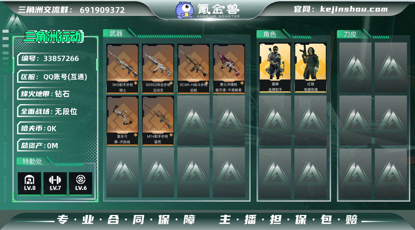 实名: 不可修改 烽火地带段位: 钻石 全面战场段位: 无段位 总资产: 55 哈夫币: 3 干员外观: 红狼-电锯惊魂,露娜-金牌射手(S7) 传说武器皮肤: 复合弓-黑-天际线,勇士冲锋枪-能天使-午夜邮差,SCAR-H战斗步枪-启航,SG552突击步枪-运动员,SKS射手步枪-骑士,M14射手步枪-蛮荒