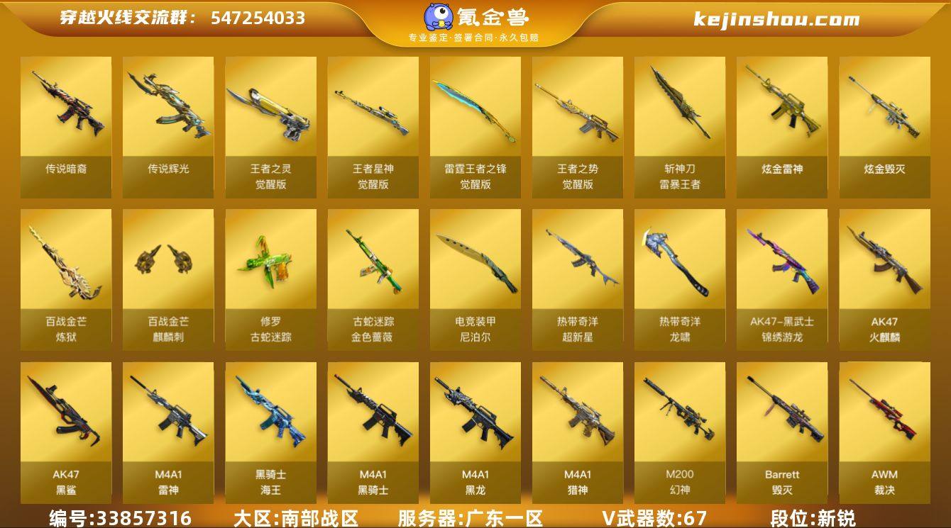 【C6690】广东一区-73V-9王者武器数-2炫金武器数 【传说武器】:传说暗裔,传说辉光 【热门武器】:传说暗裔,传说辉光,QBZ03-金色蔷薇,M14EBR-玄武,Scar Light-白虎,HK417-朱雀,M200-幻神,金色蔷薇-古蛇迷踪,修罗-古蛇迷踪,M4A1-黑骑士,汤姆逊-烈龙*6,RPK-盘龙*2,加特林-炼狱*3,斯泰尔-蝴蝶,沙鹰-修罗*2,炽芒蝶刃,黄金猫猫手套-白鲨 【王者炫金武器】:斩神刀-雷暴王者,高爆手雷-雷霆王者*2,炫金雷神,炫金毁灭 【音效卡】:屠龙-电竞之星-竞星跃动音效卡,M4A1-黑骑士音效卡,QBZ03-金色蔷薇音效卡,HK417-朱雀-电竞之星-竞星跃动音效卡,炼狱-百战金芒-庆典舞曲音效卡,白鲨语音包 【皮肤】:M200-幻神-黄忠皮肤,幻神-电流骇客 皮肤,裁决-羽掣 皮肤,白虎-电玩粉兔皮肤,白虎-量子聚变 皮肤,QBZ03-冠军之薇,金色蔷薇-电竞之星 皮肤,雷神-虎将,雷神-冠军之魄,雷神-维纳斯皮肤,M4A1-再燃火线,雷神-神秘按键 皮肤,火麒麟-平天大圣*2,毁灭-荣耀之怒,毁灭-英雄计划 皮肤,M4A1-黑龙-361,黑骑士-地狱火,黑骑士-伏羲,黑武士-典韦皮肤,战神-粉色甜心皮肤,战神-紫绶金章皮肤,AK47-B-常胜将军-刘备,修罗-冠军之魂,屠龙-春桃 皮肤,轻型军用手斧...