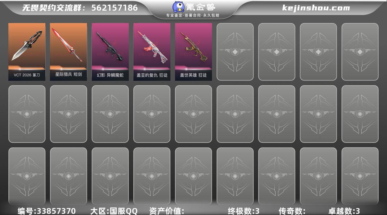 【套装】:VCT 2026 赛季套装 【英雄】:幻棱,炼狱,暮蝶,壹决,铁臂,捷风,雷兹,幽影,不死鸟,贤者,猎枭,零,芮娜,尚勃勒,霓虹,斯凯,夜露,星礈,K/O,黑梦,钢锁 【近战武器】:近战武器-VCT 2026 篆刀,近战武器-星际猎兵 短剑 【狂徒】:狂徒-荆刺圣骸,狂徒-盖世英雄,狂徒-盖亚的复仇 【幻影】:幻影-异鳞魔蛇 【骇灵】:骇灵-无限竞技 【狂怒】:狂怒-蒙太奇 【卡面】:战术桌游 卡面,浮光跃金 卡面,Clutch 卡面,无畏契约GO!第一卷:芮娜 卡面,无畏契约GO!第一卷:零 卡面,《双城之战》金克丝 卡面,铁臂设计图 卡面,代号红色 卡面,新兵报到 卡面,V契约 卡面,无畏契约 卡面 【喷漆】:蛋糕还是爆能器? 喷漆,买装还是存钱 喷漆,红鳞 喷漆,放下武器 喷漆,胜利属于无畏契约 喷漆,GLHF 喷漆,无畏契约 喷漆 【挂饰】:无畏契约GO!第一卷 芮娜 挂饰,无畏契约GO!第一卷 零 挂饰,鱼骨头 挂饰,天外飞客 挂饰,第七季//第三幕 纪念币 挂饰,幸运中国结 挂饰,无畏契约 纪念币 挂饰