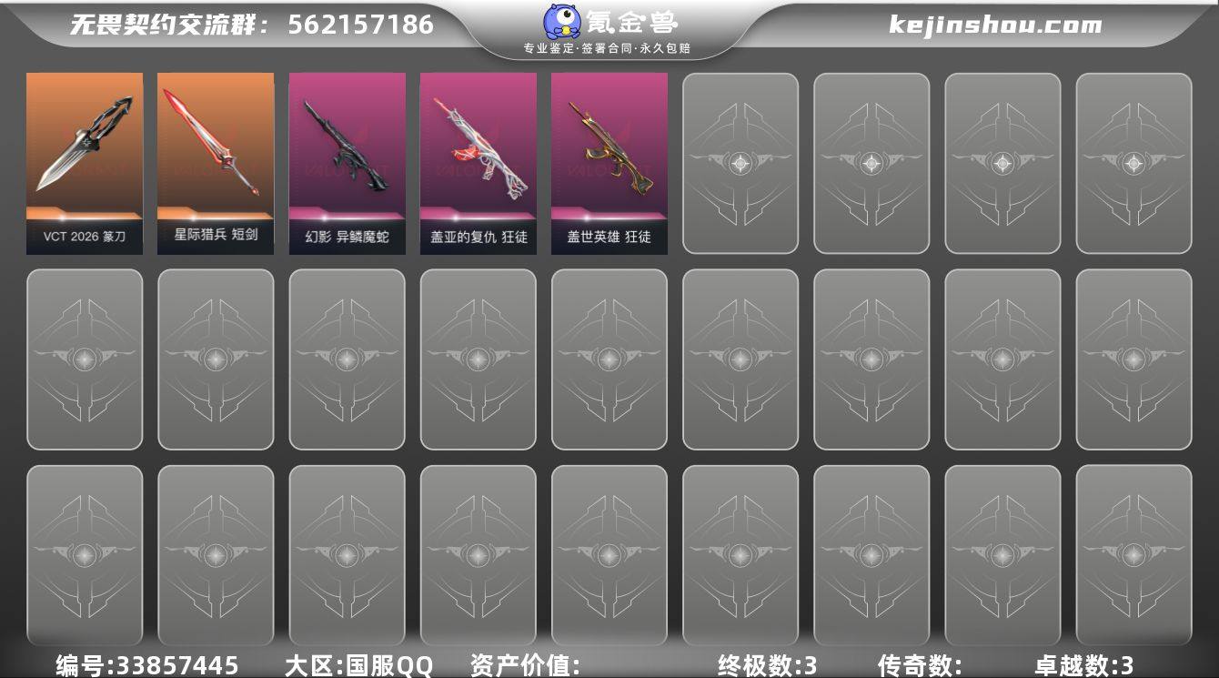 【套装】:VCT 2026 赛季套装 【英雄】:幻棱,炼狱,暮蝶,壹决,铁臂,捷风,雷兹,幽影,不死鸟,贤者,猎枭,零,芮娜,尚勃勒,霓虹,斯凯,夜露,星礈,K/O,黑梦,钢锁 【近战武器】:近战武器-VCT 2026 篆刀,近战武器-星际猎兵 短剑 【狂徒】:狂徒-荆刺圣骸,狂徒-盖世英雄,狂徒-盖亚的复仇 【幻影】:幻影-异鳞魔蛇 【骇灵】:骇灵-无限竞技 【狂怒】:狂怒-蒙太奇 【卡面】:战术桌游 卡面,浮光跃金 卡面,Clutch 卡面,无畏契约GO!第一卷:芮娜 卡面,无畏契约GO!第一卷:零 卡面,《双城之战》金克丝 卡面,铁臂设计图 卡面,代号红色 卡面,新兵报到 卡面,V契约 卡面,无畏契约 卡面 【喷漆】:蛋糕还是爆能器? 喷漆,买装还是存钱 喷漆,红鳞 喷漆,放下武器 喷漆,胜利属于无畏契约 喷漆,GLHF 喷漆,无畏契约 喷漆 【挂饰】:无畏契约GO!第一卷 芮娜 挂饰,无畏契约GO!第一卷 零 挂饰,鱼骨头 挂饰,天外飞客 挂饰,第七季//第三幕 纪念币 挂饰,幸运中国结 挂饰,无畏契约 纪念币 挂饰