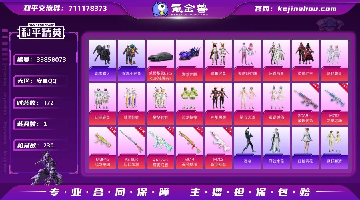 【kyhp1084】安卓 手Q-13粉装-7特效枪-2载具-3粉色飞行器-75530热力值-15王牌印记-172套装-230枪皮 【热门品类】:粉装-童趣迷兔,套装-都市猎人,套装-深海小丑鱼,套装-龟仙人 【粉色套装】:粉装-天使彩虹糖,粉装-冰霜白皇,粉装-童趣迷兔,粉装-炙焰红王,粉装-彩虹鹿灵,粉装-山涧鹿灵,粉装-精灵娃娃,粉装-酣梦娃娃,粉装-恐龙拽拽,粉装-赤焰黑爵,粉装-第五大道,粉装-绿野邂逅,粉装-蜜语绒猫 【粉色枪皮等级】:SCAR-L-童趣迷兔(七级),M762-甜心娃娃(三级),M762-冷魅冰骑(七级),UMP45-恐龙拽拽(五级),Kar98K-巳巳如意(五级),Mk14-福马献瑞(四级),AA12-G-萌骑幻想(四级) 【粉色载具】:兰博基尼Estoque(银翼灰),海龙奔腾 【粉色枪皮】:SCAR-L-童趣迷兔,M762-甜心娃娃,M762-冷魅冰骑,UMP45-恐龙拽拽,Kar98K-巳巳如意,Mk14-福马献瑞,AA12-G-萌骑幻想 【粉色飞行器】:童趣迷兔飞行器,甜心娃娃飞行器,天之羽翼飞行器 【粉色降落伞】:春暖花开降落伞,梦幻火箭降落伞,神秘黑猫降落伞,童趣迷兔降落伞,林间仙鹿降落伞,绚金瑰梦降落伞,甜心娃娃降落伞,暗星紫秘降落伞,天之羽翼降落伞,恐龙拽拽降落伞,橘柚倾心降落伞,海螺星光降落伞,第五大...