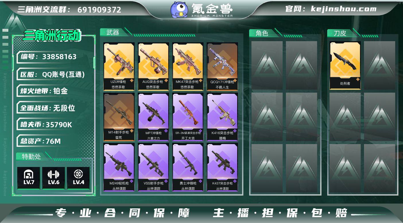 【PTSJZ4547】总资产76M/哈夫币3579万/传说近战数1/传说枪皮数5/战场等级1/行动等级56/安全箱等时效性道具以游戏内数据为准,详情请看图/近战-处刑者/近战-黑鹰/AUG突击步枪-悠然茶歇/MK47突击步枪-悠然茶歇/UZI冲锋枪-悠然茶歇/QCQ171冲锋枪-不羁人生/M14射手步枪-蛮荒/K416突击步枪-腊梅/K437突击步枪-丛林谍踪/Vector冲锋枪-猎鳄行动/SR-3M紧凑突击步枪-开工大吉/勇士冲锋枪-丛林谍踪/MP7冲锋枪-六套之力/M249轻机枪-丛林谍踪/QJB201轻机枪-炽焰/VSS射手步枪-丛林谍踪/SV98狙击步枪-猎鳄行动/SG552突击步枪-马年新春/SG552突击步枪-贴花艺术/ AK-12突击步枪-马年新春/CAR-15突击步枪-来财/KC17突击步枪-来财/MP5冲锋枪-弄臣/SMG-45冲锋枪-行动开启/SR-3M紧凑突击步枪-马年新春/M1014霰弹枪-幻影结构/Mini-14射手步枪-来财/QSZ92G-一帆风顺/SMG-45冲锋枪-斑马/QBZ95-1突击步枪-高雅黑/K416突击步枪-高雅黑/K416突击步枪-重击/AUG突击步枪-浅蓝涂装/M7战斗步枪-重击/SG552突击步枪-狂欢/SCAR-H战斗步枪-数码迷彩/G3战斗步枪-高雅黑/PTR-32突击步枪-典雅/CAR-15突击步枪-狂欢/MP5冲锋枪-海色/MP5冲锋枪-典雅/Vector冲锋枪-几何迷彩/UZI冲锋枪-海色/UZI冲锋枪-重击/M1014霰弹枪...