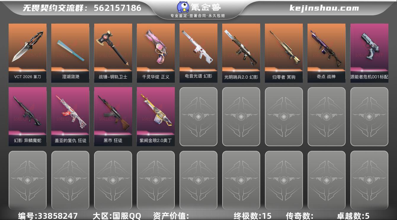 【套装】:荆刺圣骸套装,VCT 2026 赛季套装 【英雄】:幻棱,炼狱,维斯,暮蝶,钛狐,壹决,铁臂,捷风,雷兹,幽影,不死鸟,贤者,猎枭,蝰蛇,零,芮娜,奇乐,尚勃勒,霓虹,斯凯,夜露,星礈,K/O,海神,盖可,黑梦,钢锁 【近战武器】:近战武器-蒙太奇 战斧,近战武器-荆刺链刃,近战武器-VCT 2026 篆刀,近战武器-剥皮小刀,近战武器-澄湖潋滟,近战武器-钢轨卫士 战锤 【狂徒】:狂徒-荆刺圣骸,狂徒-盖亚的复仇,狂徒-黑市,狂徒-钢轨卫士 【幻影】:幻影-光明哨兵//2.0,幻影-电音光谱,幻影-异鳞魔蛇,幻影-蒙太奇,幻影-战术小伙伴,幻影-电音光谱 【戍卫】:戍卫-荆刺圣骸,戍卫-钢轨卫士 【獠犬】:獠犬-战术小伙伴 【冥驹】:冥驹-归零者 【飞将】:飞将-荆刺圣骸,飞将-光导纤维 【战神】:战神-奇点,战神-蒙太奇 【奥丁】:奥丁-紫阙金琅//2.0,奥丁-战术小伙伴 【骇灵】:骇灵-蒙太奇,骇灵-光导纤维 【蜂刺】:蜂刺-战术小伙伴 【标配】:标配-荆刺圣骸,标配-源能者危机001,标配-超能偶像,标配-光导纤维 【正义】:正义-千灵华绽,正义-沙尘幻旅,正义-复古浪潮 【鬼魅】:鬼魅-流星兵团,鬼魅-光导纤维 【狂怒】:狂怒-钢轨卫士,狂怒-蒙太奇 【...