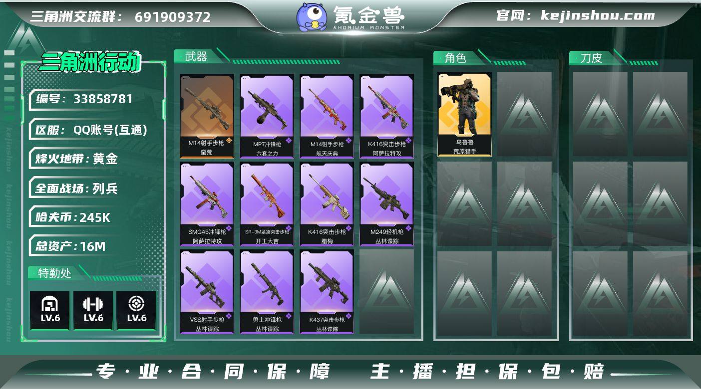 【PTSJZ4794】总资产16M/哈夫币24万/传说枪皮数1/战场等级6/行动等级60/安全箱等时效性道具以游戏内数据为准,详情请看图/乌鲁鲁-荒原猎手/近战-黑鹰/M14射手步枪-蛮荒/K416突击步枪-腊梅/K416突击步枪-阿萨拉特攻/K437突击步枪-丛林谍踪/SMG45冲锋枪-阿萨拉特攻/SR-3M紧凑突击步枪-开工大吉/勇士冲锋枪-丛林谍踪/MP7冲锋枪-六套之力/M249轻机枪-丛林谍踪/QJB201轻机枪-炽焰/VSS射手步枪-丛林谍踪/M14射手步枪-航天庆典/SG552突击步枪-马年新春/SG552突击步枪-贴花艺术/ AK-12突击步枪-马年新春/SCAR-H战斗步枪-荣耀列队/G3战斗步枪-猛禽/CAR-15突击步枪-来财/KC17突击步枪-来财/Vector冲锋枪-先锋/SMG-45冲锋枪-行动开启/SR-3M紧凑突击步枪-马年新春/勇士冲锋枪-冰天雪地/QJB201轻机枪-哈夫克卫队/Mini-14射手步枪-来财/SR-25射手步枪-开拓/QSZ92G-一帆风顺/G18-星链科技/G18-哈夫克航天/M4A1突击步枪-高雅黑/M4A1突击步枪-海色/QBZ95-1突击步枪-海浪/K416突击步枪-几何迷彩/K416突击步枪-高雅黑/K416突击步枪-重击/M16A4突击步枪-出货/AUG突击步枪-浅蓝涂装/M7战斗步枪-红色涂装/M7战斗步枪-重击/SG552突击步枪-海浪/SG552突击步枪-狂欢/SCAR-H战斗步枪-数码迷彩/PTR-32突击...