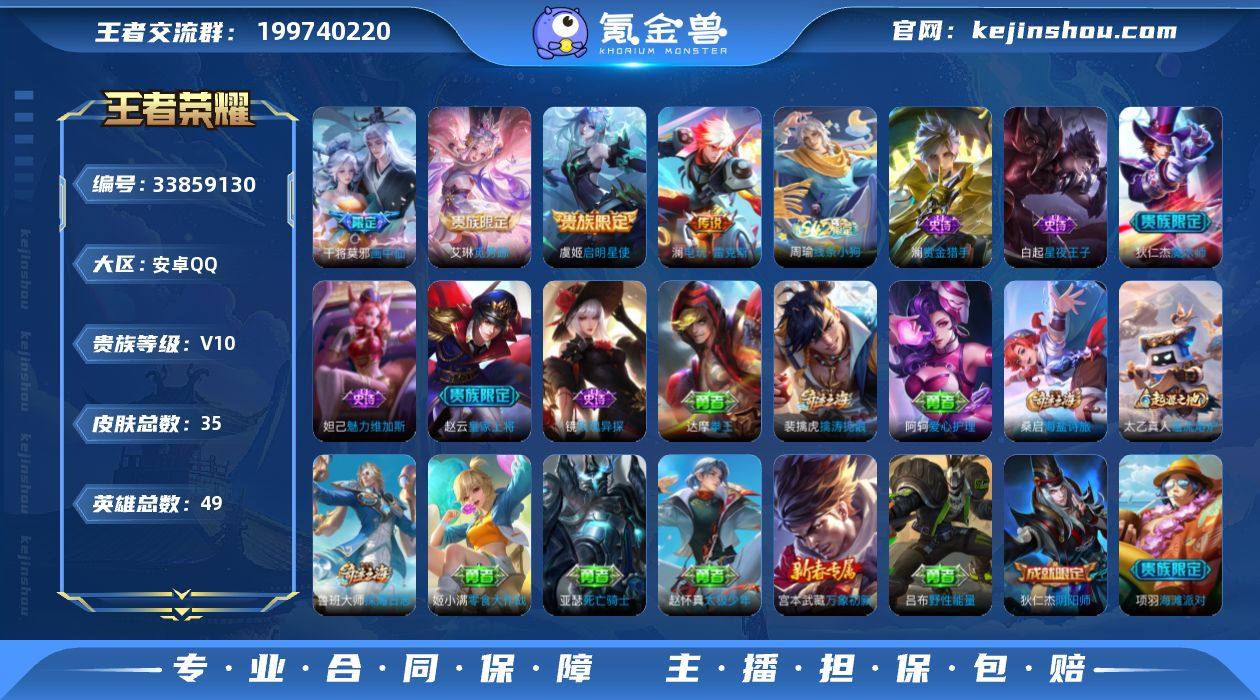 可换绑【V10玩具小号·贵族积分22w·觅芳踪·澜电玩·画中仙】 234戳戳 4按键 1王者印记 可二次 安卓Q-V10-49英雄-35皮肤-4传说-6史诗【传说皮肤】:艾琳觅芳踪,澜电玩雷克斯,干将莫邪画中仙,虞姬启明星使【限定皮肤】:狄仁杰阴阳师,赵云皇家上将,狄仁杰魔术师,项羽海滩派对,虞姬启明星使,干将莫邪画中仙,裴擒虎擒涛扼浪,鲁班大师探海日志,桑启海盐诗旅,艾琳觅芳踪【赛季限定】:桑启海盐诗旅,裴擒虎擒涛扼浪,鲁班大师探海日志,太乙真人谧流熔炉【战令限定】:周瑜线条小狗【史诗皮肤】:周瑜线条小狗,镜玫瑰异探,澜赏金猎手,白起星夜王子,妲己魅力维加斯,狄仁杰魔术师,赵云皇家上将【其他皮肤】:太乙真人谧流熔炉,姬小满零食大作战,鲁班大师探海日志,太乙真人劲辣红锅,裴擒虎擒涛扼浪,赵怀真太极少年,桑启海盐诗旅,刘禅唤灵魔甲,吕布野性能量,狄仁杰阴阳师,宫本武藏万象初新,达摩拳王,亚瑟死亡骑士,阿轲爱心护理,项羽海滩派对,澜孤猎,镜冰刃幻境,马超幸存者,曜归虚梦演,李信灼热之刃,干将莫邪第七人偶,诸葛亮星航指挥官,雅典娜战争女神,兰陵王隐刃