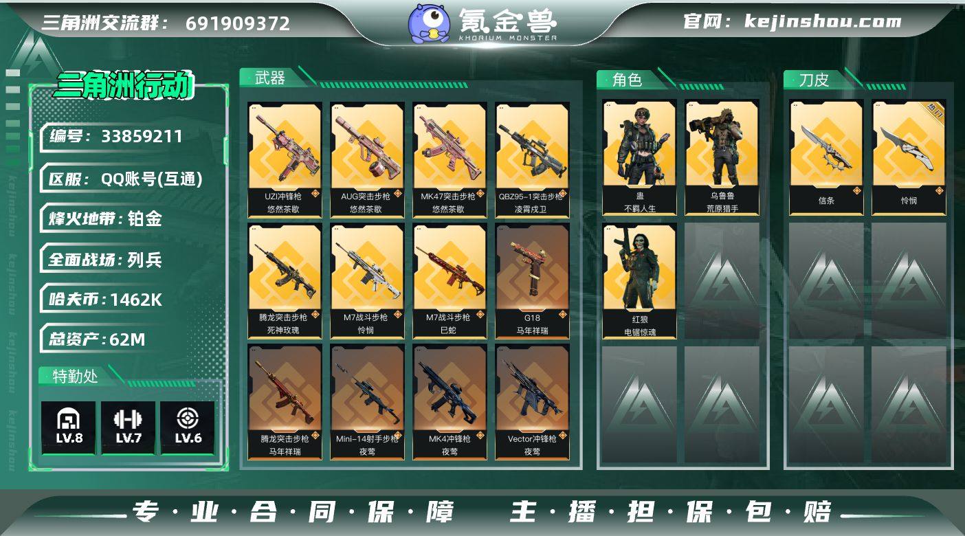 【PTSJZ4645】总资产62M/哈夫币146万/传说近战数1/传说枪皮数22/战场等级10/行动等级60/安全箱等时效性道具以游戏内数据为准,详情请看图/红狼-电锯惊魂/乌鲁鲁-荒原猎手/蛊-不羁人生/近战-信条/近战-怜悯/近战-黑鹰/QBZ95-1突击步枪-凌霄戍卫/AUG突击步枪-悠然茶歇/M7战斗步枪-怜悯/M7战斗步枪-巳蛇/AK-12突击步枪-夜鹰/SCAR-H战斗步枪-启航/腾龙突击步枪-死神玫瑰/腾龙突击步枪-马年祥瑞/腾龙突击步枪-万金泪冠/KC17突击步枪-电锯惊魂/MK47突击步枪-悠然茶歇/Vector冲锋枪-能天使-午夜邮差/Vector冲锋枪-夜莺/UZI冲锋枪-悠然茶歇/勇士冲锋枪-能天使-午夜邮差/勇士冲锋枪-万金泪冠/MK4冲锋枪-夜莺/Mini-14射手步枪-夜莺/M14射手步枪-蛮荒/SKS射手步枪-骑士/AWM狙击步枪-万金泪冠/G18-马年祥瑞/AKM突击步枪-林中猎手/K416突击步枪-冬日风情/K416突击步枪-腊梅/K416突击步枪-阿萨拉特攻/AUG突击步枪-蝮蛇/SCAR-H战斗步枪-囚徒/G3战斗步枪-哈夫克警备/K437突击步枪-丛林谍踪/MP5冲锋枪-战术竞备/MP5冲锋枪-竞技风/Vector冲锋枪-阿萨拉文明/Vector冲锋枪-猎鳄行动/SMG45冲锋枪-阿萨拉特攻/SR-3M紧凑突击步枪-战术竞备/SR-3M紧凑突击步枪-开工大吉/勇士冲锋枪-丛林谍踪/MP7冲锋枪-...