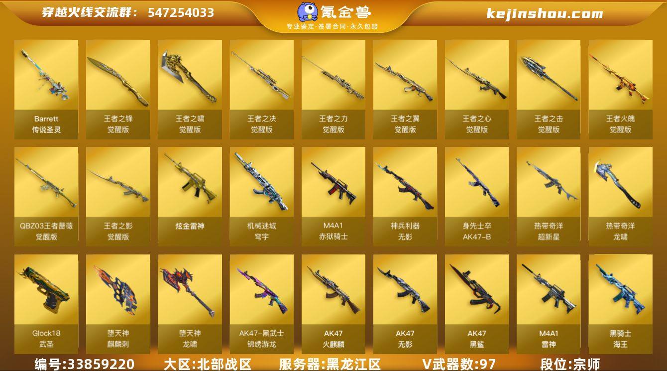 【C6804】黑龙江区-106V-12王者武器数-1炫金武器数 【传说武器】:传说圣灵 【热门武器】:传说圣灵,QBZ03-金色蔷薇,Scar Light-白虎,HK417-朱雀,M200-幻神,M200-竞技荣光,死亡之眼,荣耀世冠-火麒麟,白虎-电玩蓝兔,Kar98K-星神,C.A.T,炼狱-迷你小钢,毒蜂,M4A1-黑骑士,汤姆逊-烈龙*6,加特林-炼狱*3,斯泰尔-蝴蝶,裁决-雪莉杨,火麒麟-绝迹,USP-雷暴,沙鹰-修罗,金刚伞 【王者炫金武器】:王者之魄闪光弹,炫金雷神 【音效卡】:M200-幻神音效卡,AK47-火麒麟音效卡,M4A1-雷神音效卡,M4A1-黑骑士音效卡,Barrett-毁灭音效卡,QBZ03-金色蔷薇音效卡 【皮肤】:金色蔷薇-枪娘阿敏 皮肤,雷神-星空,雷神-虎将,雷神-冠军之魄,雷神-机甲刑天皮肤,雷神-宇航兔皮肤,烈龙-星空,火麒麟-AG战队皮肤,火麒麟-冠军之心,火麒麟-华夏之心,火麒麟-战神关羽,火麒麟-平天大圣,火麒麟-百城,火麒麟-心动糖果,毁灭-星空,毁灭-冠军之怒,毁灭-风暴,毁灭-虹光风暴 皮肤*2,M4A1-千变-孔明皮肤*2,M4A1-黑龙-361,黑骑士耀金皮肤,黑骑士-冠军之势,无影-能量核心,无影-霓裳皮肤,AK47-黑武士-361,战神-粉色甜心皮肤,战神-紫绶金章皮肤*4,战神-流金岁月皮肤,AK4...