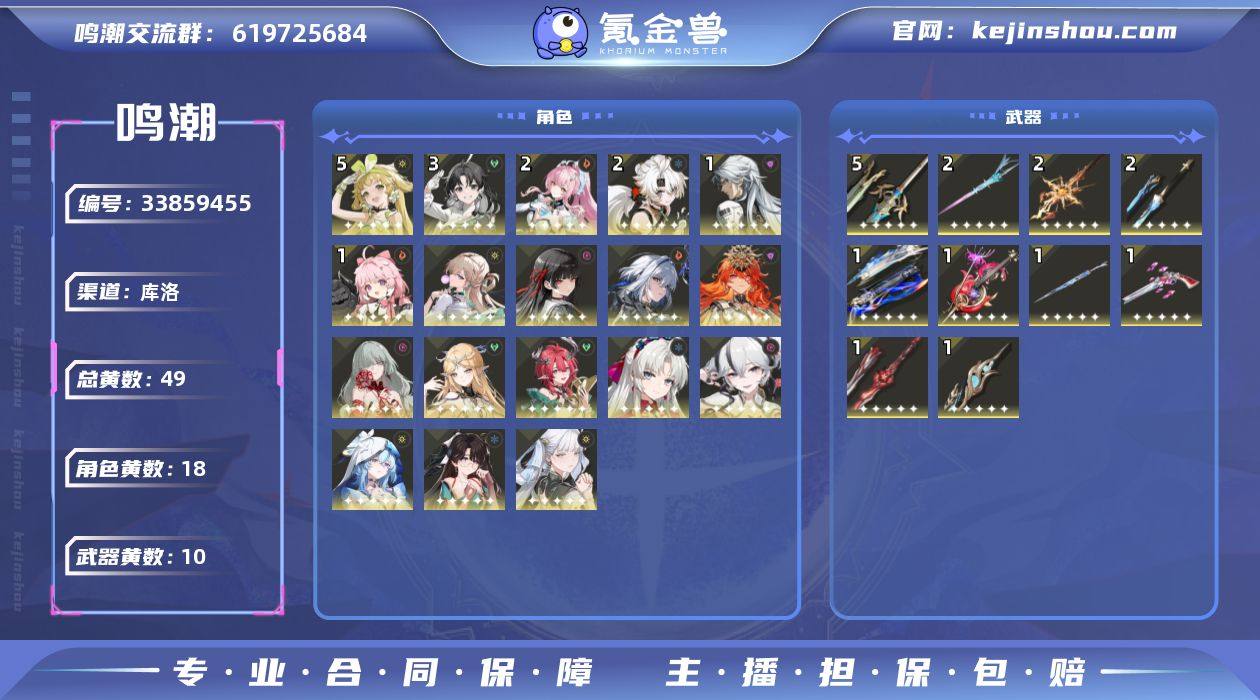 男/女主: 男主 总黄数: 49 联觉等级: 80 拥有五星共鸣者: 鉴心,卡卡罗,安可,维里奈,凌阳,今汐,折枝,守岸人,椿,珂莱塔,夏空,卡提希娅,弗洛洛,奥古斯塔,嘉贝莉娜,千咲,琳奈,爱弥斯 5鸣五星共鸣者: 5鸣维里奈 3鸣五星共鸣者: 3鸣鉴心 2鸣五星共鸣者: 2鸣凌阳,2鸣爱弥斯 1鸣五星共鸣者: 1鸣卡卡罗,1鸣安可 0鸣五星共鸣者: 0鸣今汐,0鸣折枝,0鸣守岸人,0鸣椿,0鸣珂莱塔,0鸣夏空,0鸣卡提希娅,0鸣弗洛洛,0鸣奥古斯塔,0鸣嘉贝莉娜,0鸣千咲,0鸣琳奈 拥有五星武器: 千古洑流,时和岁稔,裁春,死与舞,血誓盟约,不屈命定之冠,幽冥的忘忧章,驭冕铸雷之权,光影双生,永远的启明星 5鸣五星武器: 5鸣血誓盟约 2鸣五星武器: 2鸣千古洑流,2鸣驭冕铸雷之权,2鸣永远的启明星 1鸣五星武器: 1鸣时和岁稔,1鸣裁春,1鸣死与舞,1鸣不屈命定之冠,1鸣幽冥的忘忧章,1鸣光影双生 亮点: 【MC395】80级/49黄/男主/18个五星角色/10个五星武器未绑定,爱弥斯,夏空,卡提希娅,弗洛洛,奥古斯塔,嘉贝莉娜,千咲,琳奈,椿,今汐,珂莱塔,守岸人,折枝,维里奈,卡卡罗,鉴心,安可,凌阳,永远的启明星,光影双生,驭冕铸雷之权,幽冥的忘忧章,不屈命定之冠,血誓盟约,死与舞,裁春,时和岁稔,千古洑流,5命维里奈,3命鉴心,2命爱弥斯,2命凌阳,...