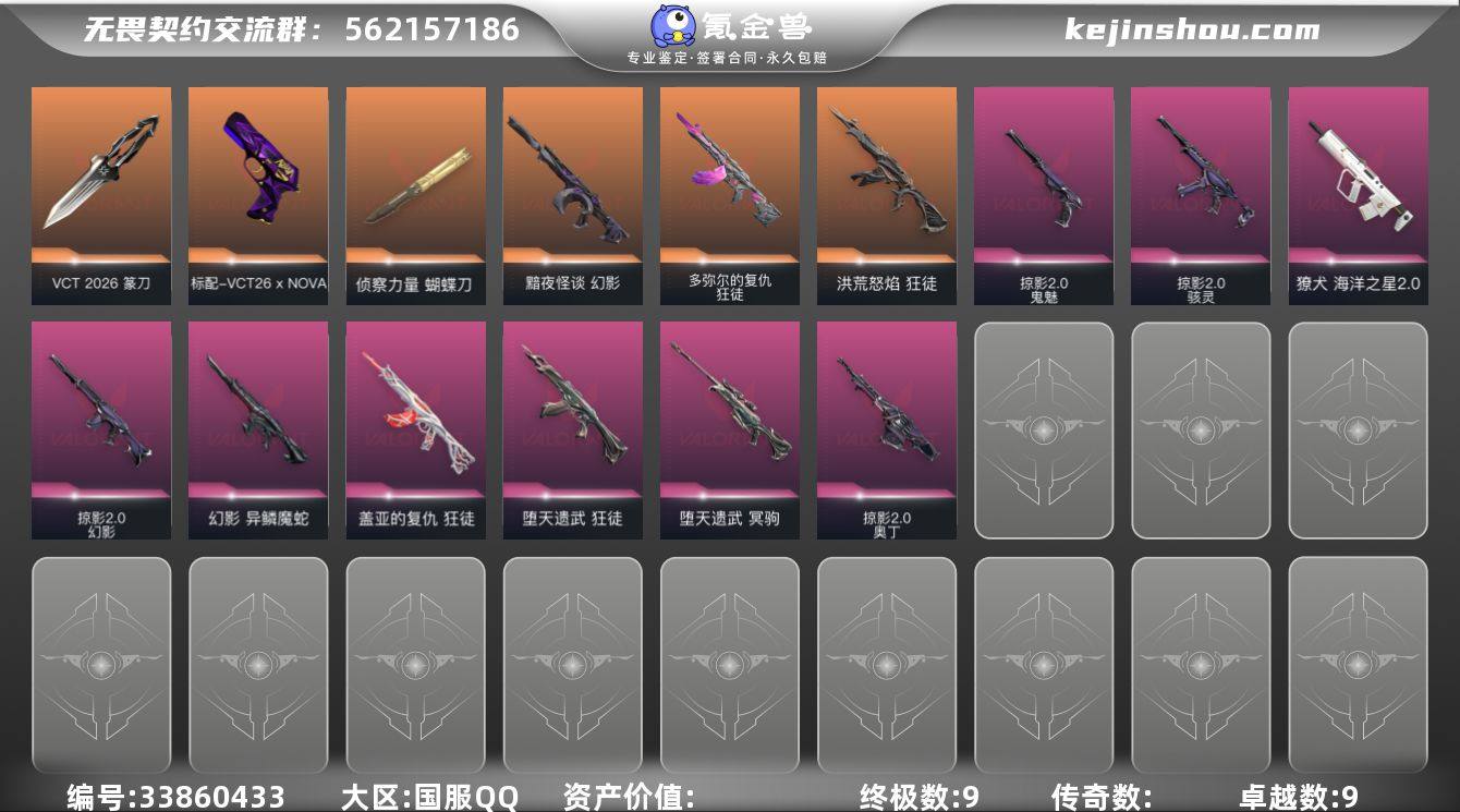 L3116 【精品号】26vct 蛇年幻影 流脓狂徒 黯夜怪谈幻影 侦查蝴蝶 石头 狂徒 弃王狂徒 盖亚狂徒 弃王冥驹 掠夺爪刀 掠夺幻影 掠夺奥丁 掠夺鬼魅 库存:27510 剩余VP:95剩余R点:15 段位: 铂金1历史最高段位:铂金1