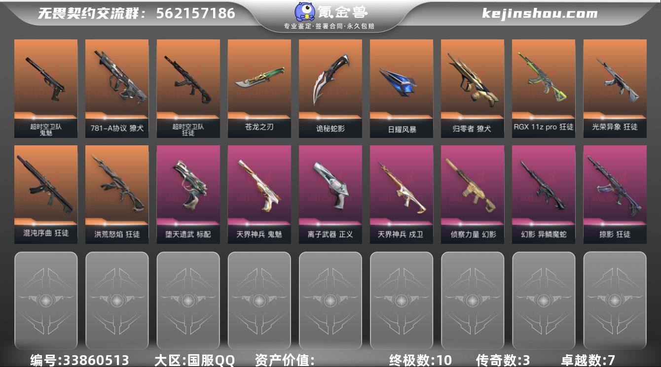 L3527 【性价比】超时空狂徒 超时空鬼魅 781獠犬 5周年刀 魔蛇幻影 离子正义 归零獠犬 堕天标配 光荣异象狂徒 显卡狂徒 天界戍卫 侦查幻影 流脓狂徒 混沌狂徒 天界鬼魅 紫金爪刀 掠夺狂徒 影刃库存:30690 剩余VP:97剩余R点:30 段位:钻石历史最高:超凡