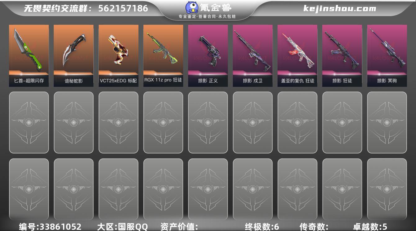 【编号18493 可秒换绑】【店长推荐!极品小号!RGX11z Pro狂徒 影钩 VCT25 x EDG 标配 诡秘蛇影军刀 盖亚狂徒 掠影正义 掠影狂徒!!! !】 【套装】:掠影套装 【英雄】:幻棱,炼狱,维斯,暮蝶,钛狐,壹决,铁臂,捷风,雷兹,幽影,不死鸟,贤者,猎枭,蝰蛇,零,芮娜,奇乐,尚勃勒,霓虹,斯凯,夜露,星礈,K/O,海神,盖可,黑梦,钢锁 【近战武器】:近战武器-影钩,近战武器-超限闪存 匕首,近战武器-影刃,近战武器-诡秘蛇影 军刀 【狂徒】:狂徒-RGX 11z Pro,狂徒-掠影,狂徒-盖亚的复仇,狂徒-诡秘蛇影 【幻影】:幻影-超限闪存,幻影-末日之翼 【戍卫】:戍卫-掠影,戍卫-浮光跃金,戍卫-折光棱晶 【獠犬】:獠犬-模拟赫兹 【冥驹】:冥驹-掠影,冥驹-模拟赫兹 【飞将】:飞将-末日之翼 【莽侠】:莽侠-超限闪存,莽侠-诡秘蛇影 【战神】:战神-浮光跃金 【奥丁】:奥丁-末日之翼 【判官】:判官-诡秘蛇影 【雄鹿】:雄鹿-模拟赫兹 【骇灵】:骇灵-浮光跃金 【蜂刺】:蜂刺-超限闪存,蜂刺-折光棱晶 【标配】:标配-浮光跃金,标配-折光棱晶 【VCT手枪】:标配-VCT25 x EDG 【正义】:正义-掠影,正义-超限闪存,正义-纳米打击 【鬼魅】:鬼魅-诡秘蛇...