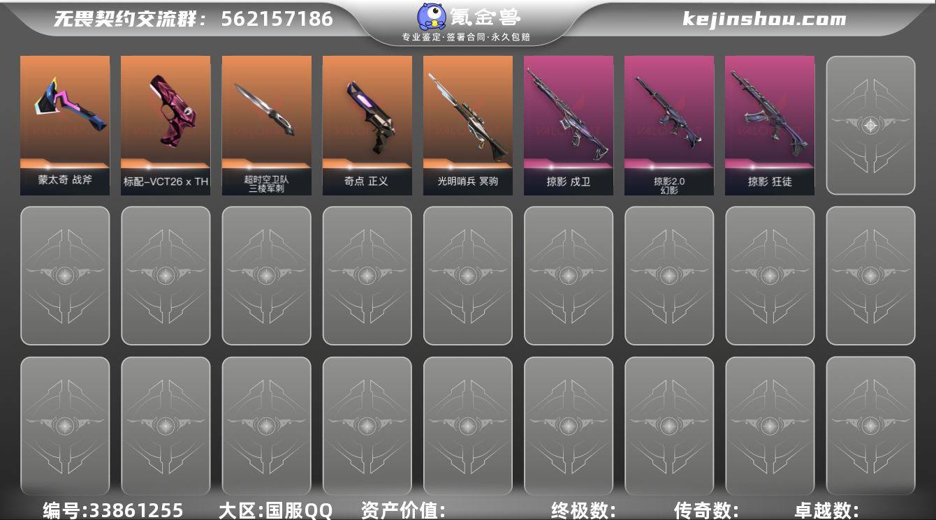 【无畏契约】等级:34,已用无畏点20970,已用源晶点235,橙皮:正义-奇点|冥驹-光明哨兵|狂徒-RGX 11z Pro|近战-超时空卫队 三棱军刺|近战-魔术火花|近战-蒙太奇 战斧|标配-VCT26 x TH__段位:未定级__紫皮:狂徒-掠影|戍卫-掠影|幻影-掠影2.0__英雄:尚勃勒|维斯|黑梦|壹决|炼狱|贤者|猎枭|芮娜|捷风|不死鸟|幻棱__绿皮:战神-蒙太奇|幻影-蒙太奇|狂怒-蒙太奇|骇灵-蒙太奇__蓝皮:雄鹿-风暴之子|戍卫-风暴之子|正义-风暴之子|冥驹-风暴之子|狂徒-超集系统|标配-超集系统|飞将-超集系统