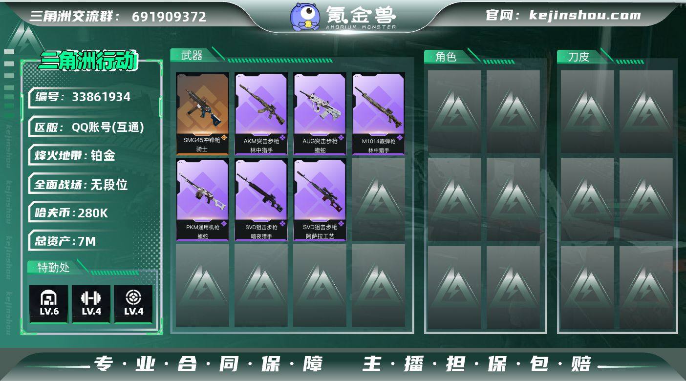 编号99812 不可二次 等级52 总资产7m 流动资产280k 哈夫币280k 基础安全箱 仓库LV6 训练中心LV4 靶场LV4
