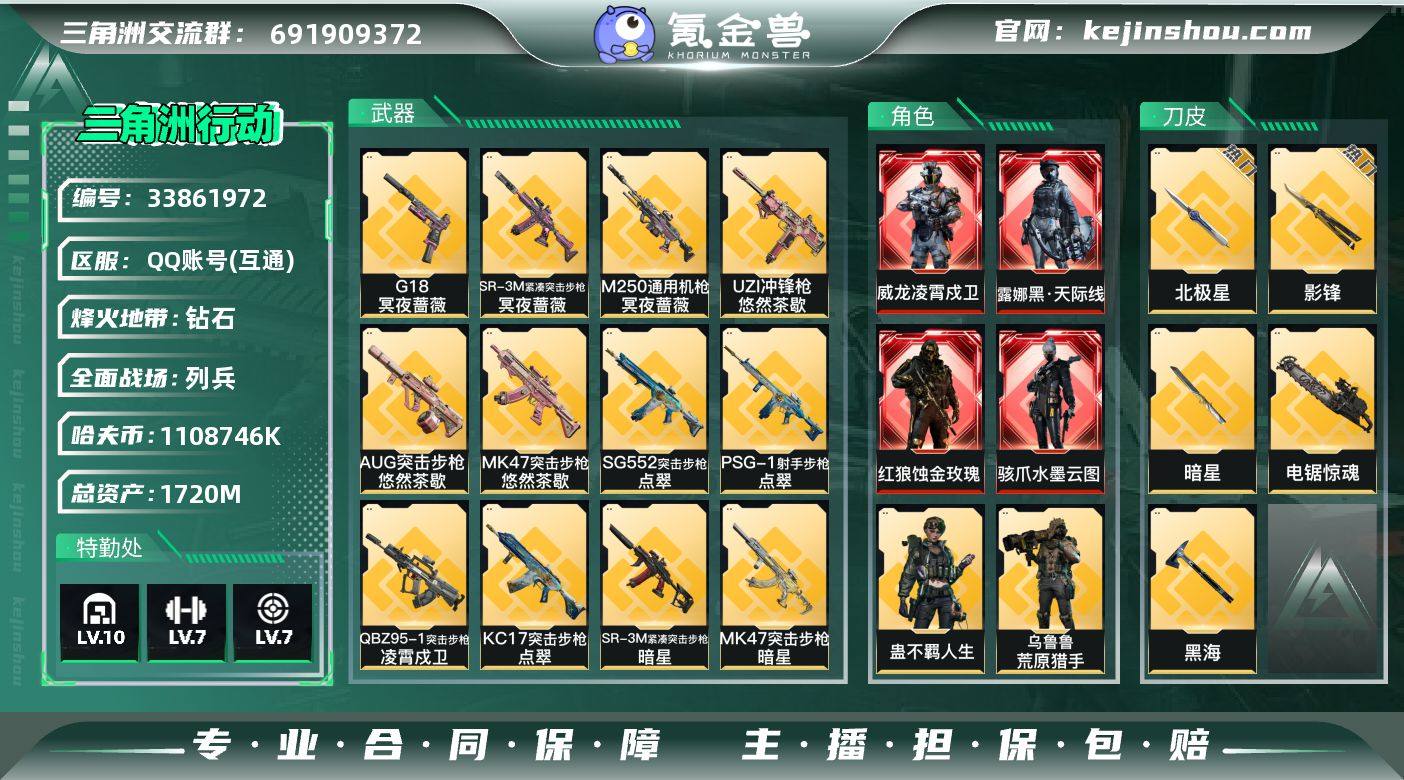A13064/包人脸/QQ区【总资产:1.7B(1108M纯币)+近战北极星+近战黑海+近战影锋+近战暗星+近战电锯惊魂+近战处刑者+红狼蚀金玫瑰+威龙凌霄戍卫+骇爪水墨云图+露娜黑天际线+威龙飞虎+S9赛季3X2+部门全4+特勤处全满级】/烽火等级:60级/全面战场:31级/纯币:1108746K/三角券加币:489(三角币129+三角券360)【近战-北极星/近战-黑海/近战-影锋/近战-暗星/近战-电锯惊魂/近战-处刑者】【红狼-蚀金玫瑰/威龙-凌霄戍卫/骇爪-水墨云图/露娜-黑天际线】【威龙-飞虎/威龙-壮志凌云/红狼-电锯惊魂/深蓝-不破誓约/露娜-金牌射手/牧羊人-街头之王/蜂医-送葬人无题密令/乌鲁鲁-荒原猎手/无名-夜鹰/蛊-不羁人生】/部门:44444/特勤等级(技术中心3级/工作台3级/制药台3级/防具台3级/仓库10级/指挥中心6级/训练中心7级/靶场7级/潜水中心3级/收藏室2级)(流动资产:1.6B)M4A1突击步枪-蚀金玫瑰/QBZ95-1突击步枪-凌霄戍卫/AK-12突击步枪-夜鹰/SCAR-H战斗步枪-水墨云图/K437突击步枪-北极星/KC17突击步枪-电锯惊魂/MK47突击步枪-暗星/SR-3M紧凑突击步枪-暗星/QCQ171冲锋枪-北极星/橙色挂饰x17/段位:钻石I/详细看图