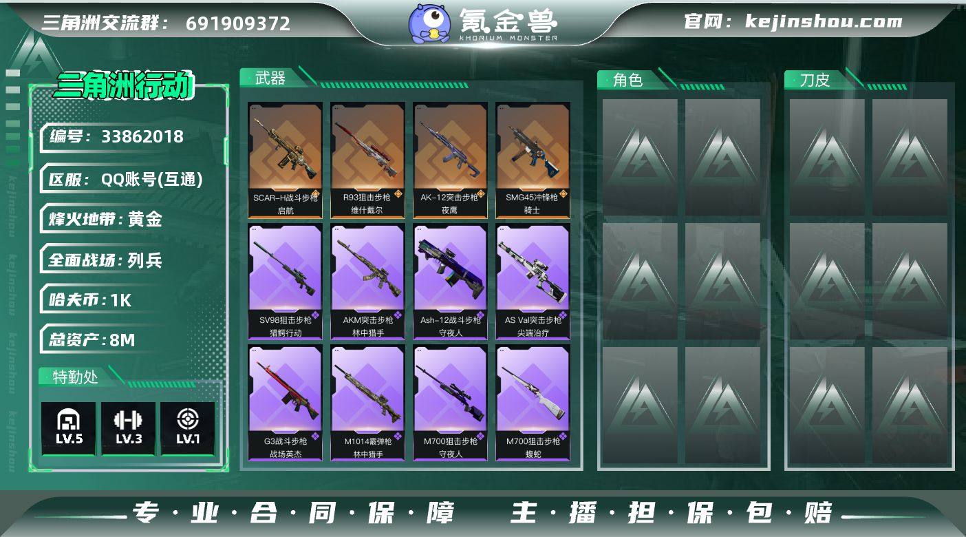 编号99610 不可二次 等级57 总资产8.7m 流动资产4.7m 哈夫币100 基础安全箱 仓库lv5 训练中心lv3 靶场lv1