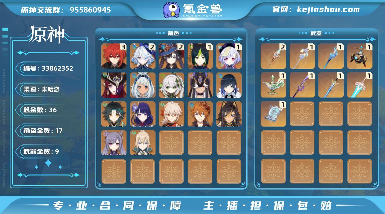 58级/36黄/男主/17个五星角色/9个五星武器/雷电将军/夜兰/三命迪卢克/二命芙宁娜/恰斯卡/枫原万叶/魈/琴/纳西妲/达达利亚/赛诺/一命提纳里/玛拉妮/一命七七/二命莫娜/刻晴/迪希雅/金流监督/千夜浮梦/柔灯挽歌/薙草之稻光/天空之脊/静水流涌之辉/苍古自由之誓/四风原典/天空之傲