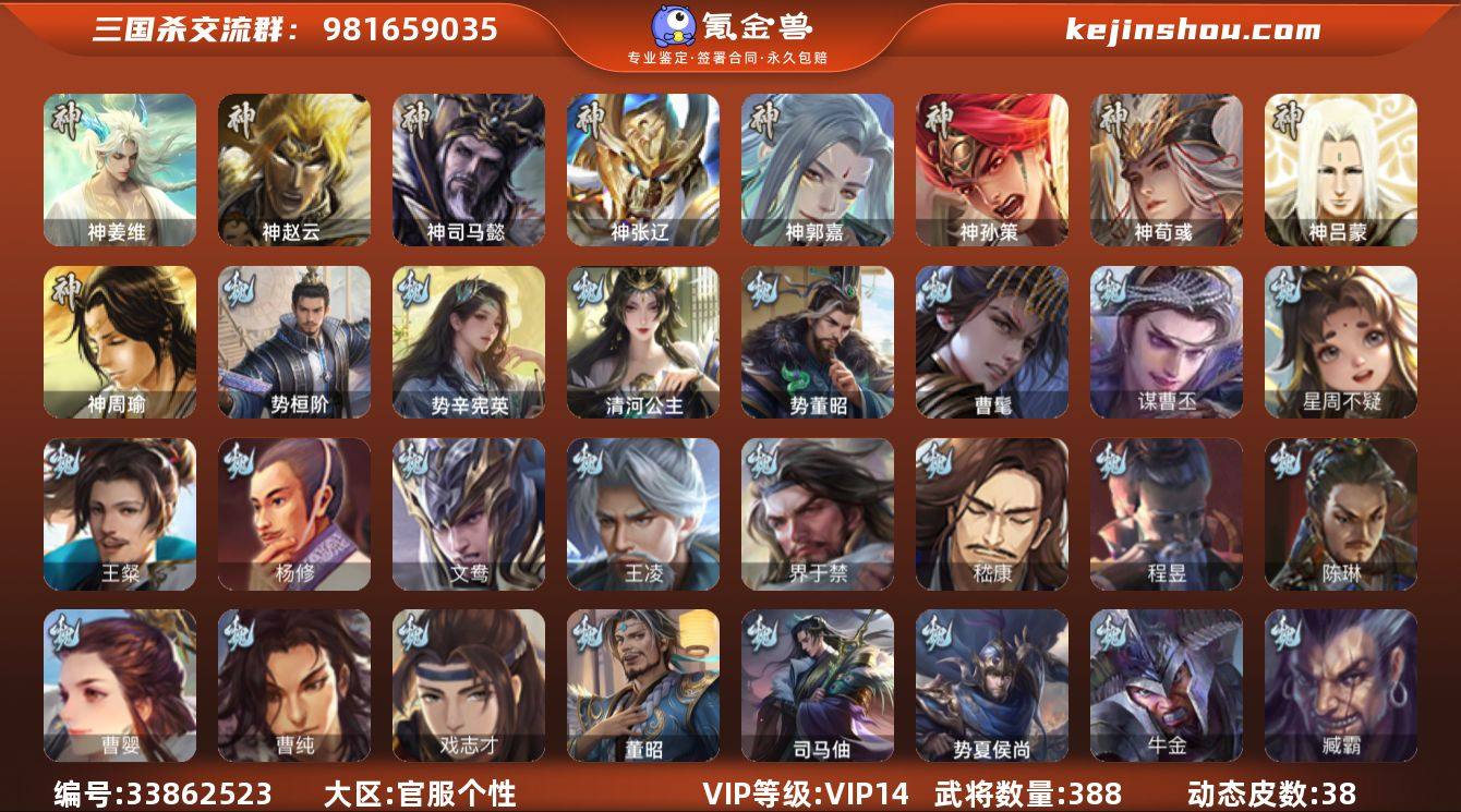 【JYSGS385】官阶:大将军 VIP等级:VIP14级 史诗武将数:69 动态皮肤数:38 武将总数:388 史诗宝珠数:5 元宝数:5364 将魂数:7418 /神姜维/神赵云/神司马懿/神张辽/神郭嘉/神孙策/神荀彧/势董昭/势辛宪英/势桓阶/谋曹丕/王粲/王凌/界于禁/嵇康/程昱/戏志才/杨修/陈琳/曹婴/清河公主/曹髦/曹纯/星周不疑/谋诸葛亮/谋赵云/谋黄忠/谋关羽/花鬘/马云騄/张星彩/董允/赵襄/关索/周群/谯周/文鸯/势太史慈/骆统/周处/界徐盛/界步练师/界朱然/贺齐/孙寒华/张奋/司马昭/左慈/杜预/沮授/界李儒/界沮授/张让/麹义/陶谦/士燮/司马徽/卑弥呼/刘焉/苏飞/徐荣/张琪瑛/兀突骨/SP甄姬/南华老仙/星甘宁/星黄忠/星董卓/友诸葛亮/蒯越蒯良/毌丘俭/势夏侯尚/谋于禁/卞夫人/华歆/蔡贞姬/崔琰/界曹操/界司马懿/界夏侯惇/界张辽/界许褚/界郭嘉/界甄姬/界夏侯渊/界典韦/界荀彧/界徐晃/界曹丕/界邓艾/张春华/钟会/曹冲/郭淮/满宠/曹真/韩浩史涣/陈群/曹叡/曹休/钟繇/界曹植/界王异/界曹彰/界满宠/界郭淮/郭皇后/孙资刘放/辛宪英/诸葛诞/曹昂/SP关羽/SP姜维/文聘/乐进/司马朗/SP蔡文姬/李通/李典/吕虔/杜畿/鲁芝/张恭/阮慧/朱灵/司马伷/董昭/唐咨/孟达/臧霸/骥李典/牛金/华雄/袁术/卢植/仲帝袁术/势田丰/谋刘赪...