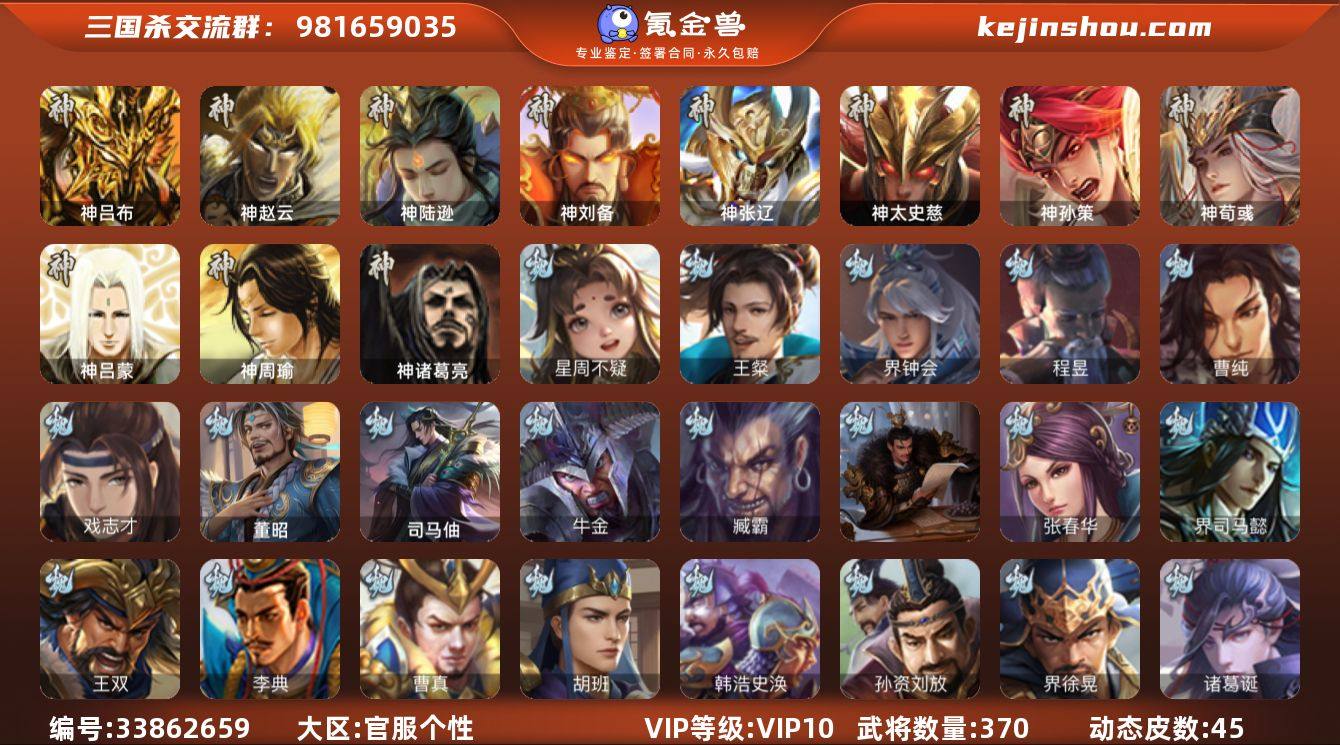 【14788635】官阶:大将军;VIP等级:VIP10;史诗武将数量:42;动态皮肤数量:45;武将总数:370;史诗宝珠数量:0;将魂数量:14648;神将:9;魏国史诗武将:20;蜀国史诗武将:11;吴国史诗武将:4;群史诗武将:14