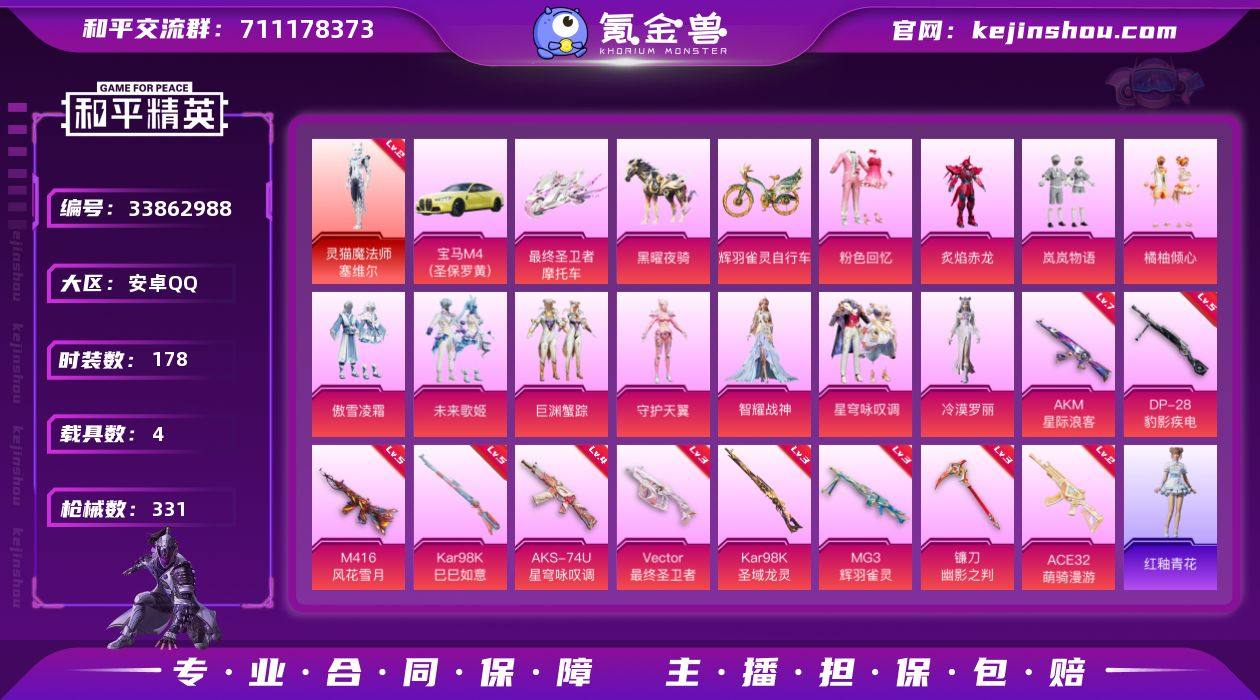 安卓 手Q-1神装-11粉装-10特效枪-4载具-8粉色飞行器-104400热力值-14王牌印记-178套装-331枪皮 【红色神装等级】:灵猫魔法师-塞维尔(二级) 【红色角色神装】:灵猫魔法师-塞维尔 【热门品类】:绝对防御上衣,套装-龟仙人,角色-8号机,角色-Mark.06 【粉色套装】:粉装-粉色回忆,粉装-炙焰赤龙,粉装-岚岚物语,粉装-橘柚倾心,粉装-傲雪凌霜,粉装-未来歌姬,粉装-巨渊蟹踪,角色-守护天翼,角色-智耀战神,粉装-星穹咏叹调,角色-冷漠罗丽 【粉色枪皮等级】:AKM-星际浪客(七级),M416-风花雪月(五级),ACE32-萌骑漫游(二级),Vector-最终圣卫者(三级),AKS-74U-星穹咏叹调(四级),Kar98K-巳巳如意(五级),Kar98K-圣域龙灵(三级),DP-28-豹影疾电(五级),MG3-辉羽雀灵(三级),镰刀-幽影之判(三级) 【粉色载具】:宝马M4(圣保罗黄),最终圣卫者摩托车,僚机-圣域龙宝,黑曜夜骑,辉羽雀灵自行车 【粉色枪皮】:AKM-星际浪客,M416-风花雪月,ACE32-萌骑漫游,Vector-最终圣卫者,AKS-74U-星穹咏叹调,Kar98K-巳巳如意,Kar98K-圣域龙灵,DP-28-豹影疾电,MG3-辉羽雀灵,镰刀-幽影之判 【粉色飞行器】:齐天大圣飞行器,天之羽翼飞行器,星夜魔法师飞行翼,千面幻镜飞行...