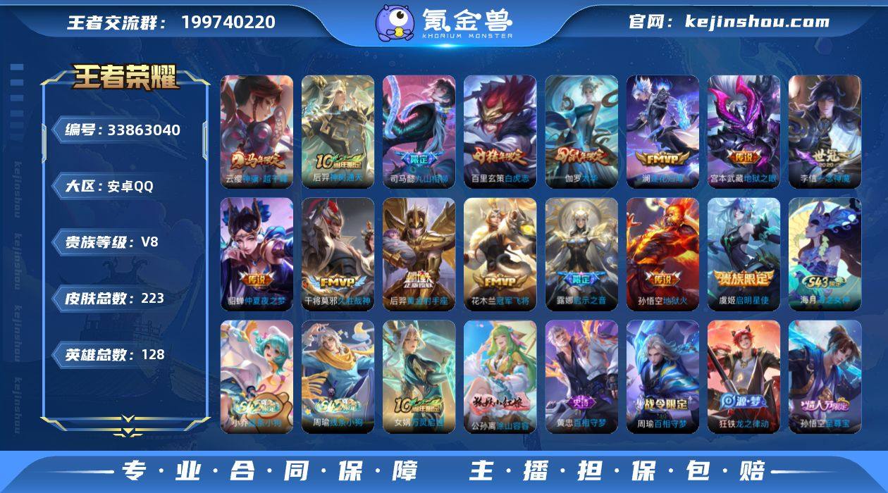 安卓Q-V8-最强王者段位-128英雄-223皮肤-15传说-56史诗 【英雄全皮】:孙权全皮,敖隐全皮 【传说皮肤】:云缨神骥越千峰,后羿神树通天,司马懿九山相柳,澜逐花归海,露娜启示之音,虞姬启明星使,李信一念神魔,伽罗太华,干将莫邪久胜战神,百里玄策白虎志,花木兰冠军飞将,后羿黄金射手座,貂蝉仲夏夜之梦,宫本武藏地狱之眼,孙悟空地狱火 【限定皮肤】:白起狰,狄仁杰阴阳师,赵云皇家上将,赵云龙胆,嬴政白昼王子,孙尚香蔷薇恋人,庄周玄嵩,高渐离死亡摇滚,芈月重明,吕布猎兽之王,元歌云间偶戏,元歌无心,夏侯惇朔风刀,甄姬幽恒,曹操烛龙,典韦穷奇,典韦岱宗,狄仁杰魔术师,狄仁杰万华元夜,达摩沙漠行僧,项羽海滩派对,老夫子醍醐杖,程咬金演武夺筹,露娜启示之音,韩信飞衡,兰陵王金庭之子,孙悟空至尊宝,孙悟空大圣娶亲,牛魔御旌,后羿如梦令,李元芳云中旅人,虞姬启明星使,钟馗驱傩正仪,太乙真人饕餮,太乙真人华丽摇滚,鬼谷子原初探秘者,百里玄策白虎志,百里玄策原初追逐者,弈星混沌棋,沈梦溪大漠名商,明世隐疑决卦,裴擒虎李小龙,裴擒虎擒涛扼浪,狂铁御狮,米莱狄御霄,云中君纤云弄巧,伽罗太华,盾山御銮,上官婉儿梁祝,嫦娥暖...
