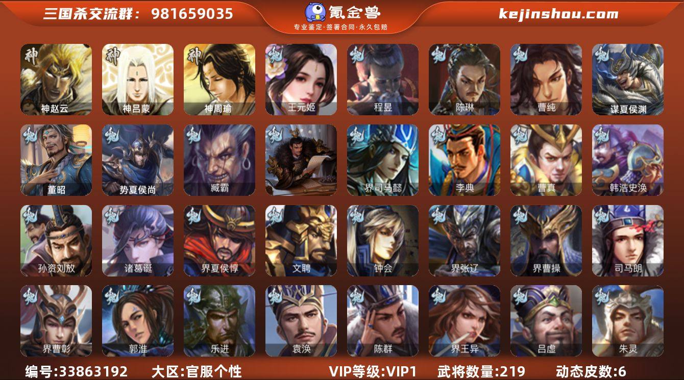 【14790418】官阶:领军将军;VIP等级:VIP1;史诗武将数量:10;动态皮肤数量:6;武将总数:219;史诗宝珠数量:0;将魂数量:3738;神将:1;魏国史诗武将:3;蜀国史诗武将:3;吴国史诗武将:0;群史诗武将:2