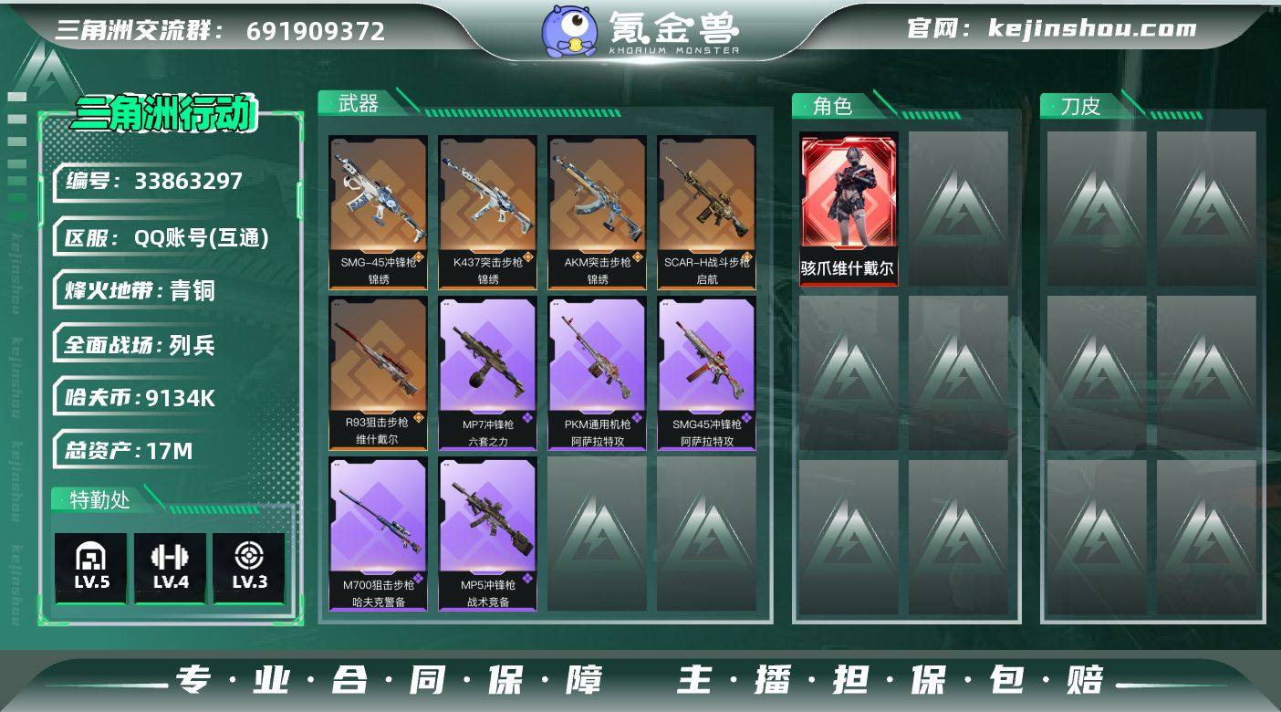 17m总资产-9134k哈夫币-39烽火等级-青铜-9战场等级-列兵 【干员外观】:骇爪-维什戴尔 【近战皮肤】:近战-黑鹰 【传说外观】:AKM突击步枪-锦绣,SCAR-H战斗步枪-启航,K437突击步枪-锦绣,SMG-45冲锋枪-锦绣,R93狙击步枪-维什戴尔 【史诗外观】:MP5冲锋枪-战术竞备,SMG-45冲锋枪-阿萨拉特攻,MP7冲锋枪-六套之力,PKM通用机枪-阿萨拉特攻,M700狙击步枪-哈夫克警备 【稀有外观】:K416突击步枪-一帆风顺,M7战斗步枪-捣蛋鬼,SG552突击步枪-2026,K437突击步枪-生存指令,MK47突击步枪-精英联盟,P90冲锋枪-捣蛋鬼,UZI冲锋枪-亚特兰蒂斯,SMG-45冲锋枪-行动开启,勇士冲锋枪-冰天雪地,M249轻机枪-冰天雪地,QJB201轻机枪-哈夫克卫队,Mini-14射手步枪-荣耀列队,SR-25射手步枪-开拓,QSZ92G-一帆风顺 【普通外观】:M4A1突击步枪-高雅黑,QBZ95-1突击步枪-2026,K416突击步枪-几何迷彩,K416突击步枪-高雅黑,M16A4突击步枪-高雅黑,M7战斗步枪-红色涂装,M7战斗步枪-黑巧甜心,SG552突击步枪-海浪,SG552突击步枪-狂欢,SCAR-H战斗步枪-数码迷彩,PTR-32突击步枪-黄蜂,AS Val突击步枪-黑巧甜心,MP5冲锋枪-海色,P90冲锋枪-黑巧甜心,UZI冲锋枪-狂欢,野牛冲锋枪-高...