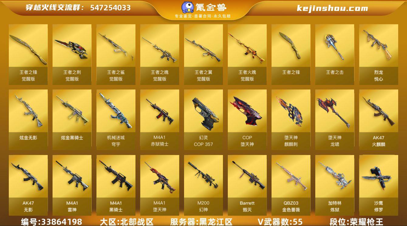 黑龙江区-64V-15王者武器数-2炫金武器数 【热门武器】:QBZ03-金色蔷薇,M200-幻神*2,C.A.T,M4A1-黑骑士,加特林-炼狱,斯泰尔-蝴蝶,雷神-小红,COP-堕天神,COP 357-幻灵,沙鹰-修罗*4 【王者炫金武器】:烈龙-悦心,王者之击,王者之锋,炫金骑士,炫金无影,王者之魄高爆手雷*2,王者之魄闪光弹*2,王者之魄烟雾弹 【音效卡】:M200-幻神音效卡,AK47-火麒麟音效卡,M4A1-黑骑士音效卡 【皮肤】:幻神-AG-CFPLS17冠军*2,雷神-暗月,雷神-烈虎皮肤,传奇石头-横秒之巅,火麒麟-平天大圣,毁灭-黑大圣皮肤,无影-能量核心,修罗-能量核心,修罗-星空 【角色】:迷迭香,影豹,王者樱-热浪之夏,王者涂鸦,嘉年华灵狐,娟娟,零-水下丽影,灵狐者-职业经理,曼陀罗-X,邱刚敖,青霞仙子,铁骑荣耀 【人偶武器】:雷神-小红,斯泰尔-蝴蝶,巴雷特-零-水下丽影,AWM-灵狐-15周年嘉年华,C.A.T 【英雄级武器】:AK47-火麒麟,M4A1-雷神,M4A1-黑骑士,AK47-无影,M4A1-堕天神*2,QBZ03-金色蔷薇,王者之翼-觉醒版,王者之魄-觉醒版,AK-47-猩红传说,王者之鲨-觉醒版,王者火魄-觉醒版,机械迷城-穹宇,Barrett-毁灭,M200-幻神*2,加特林-炼狱,沙鹰-修罗*4,沙鹰-天神,COP...