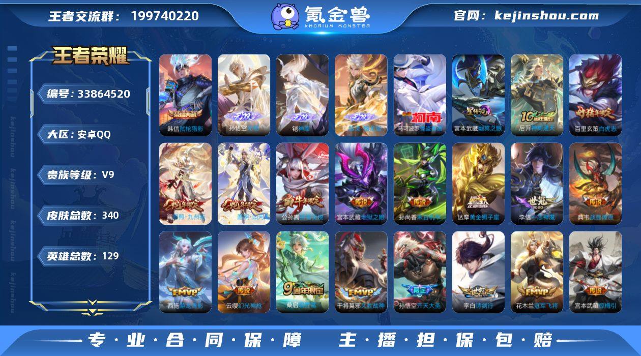 【FTWZ302】安卓Q-V9-【打野22段,补8.7点卷积分到V10贵族,1天幕1星传说】-129英雄-340皮肤-1典藏皮肤-4无双-2珍品传说-27传说-87史诗【英雄全皮】:孙权全皮,敖隐全皮,蒙恬全皮,空空儿全皮,影全皮【荣耀典藏】:韩信弑枪猎影【无双皮肤】:李信问心剑,孙悟空无相,铠神罪,曜器灵螭龙剑【珍品传说】:伽罗沧流箭,马可波罗怪盗基德【传说皮肤】:阿轲罗刹妄海,云缨神骥越千峰,狄仁杰神骥赴朔漠,马超神骥逐星野,后羿神树通天,司空震愿照山河定,澜愿照九州拓,云缨幻光神枪,桑启鸣野蒿,典韦战鼓燎原,宫本武藏惊梅引,孙悟空齐天大圣,李白诗剑行,西施游龙清影,周瑜音你心动,公孙离祈雪灵祝,铠绛天战甲,虞姬启明星使,李信一念神魔,干将莫邪久胜战神,达摩黄金狮子座,百里玄策白虎志,花木兰冠军飞将,梦奇胖达荣荣,孙尚香末日机甲,宫本武藏地狱之眼,孙悟空地狱火【限定皮肤】:白起狰,姜子牙天穹之誓,杨戬破阵退雄兵,狄仁杰阴阳师,虞姬凯尔特女王,赵云皇家上将,赵云引擎之心,嬴政白昼王子,鲁班七号狮舞东方,扁鹊奇幻香踪,芈月重明,吕布猎兽之王,元歌云间偶戏,元歌无心,曹操烛龙,典韦穷奇,典韦蓝屏警告,马可波罗山海玄木吟,狄仁杰魔...
