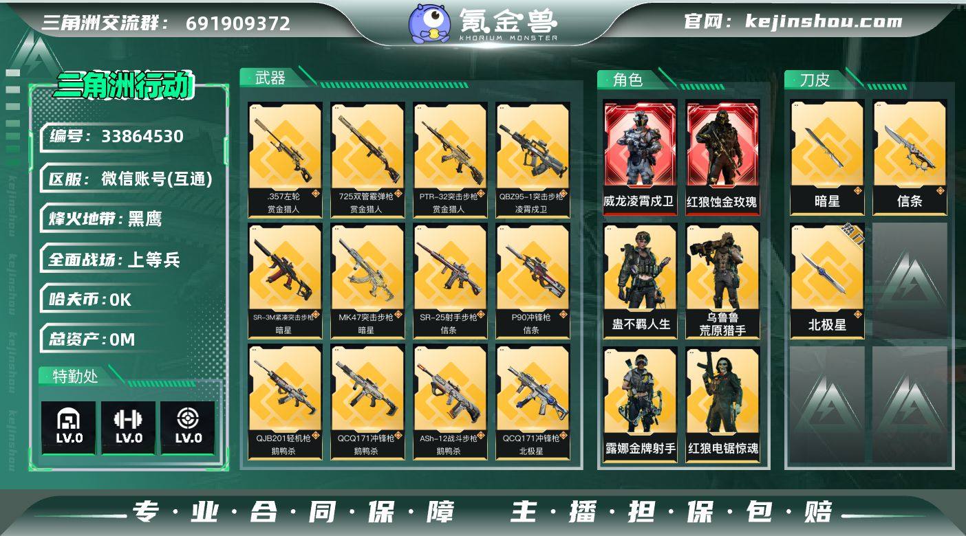 实名: 不可修改 烽火地带段位: 黑鹰 全面战场段位: 上等兵 总资产: 87 哈夫币: 2 干员外观: 红狼-蚀金玫瑰,蜂医-送葬人·无题密令(S5),红狼-电锯惊魂,露娜-金牌射手(S7),乌鲁鲁-荒原猎手,威龙-凌霄戍卫,蛊-不羁人生 传说武器皮肤: M4A1突击步枪-蚀金玫瑰,沙漠之鹰-地下交易,近战-北极星,K437突击步枪-北极星,QCQ171冲锋枪-北极星,725双管霰弹枪-送葬人-无题密令,M4A1突击步枪-阿米娅,CAR-15突击步枪-阿米娅,AWM狙击步枪-捞点薯条,93R-捞点薯条,AK-12突击步枪-特斯拉线圈,SR-3M紧凑突击步枪-特斯拉线圈,UZI冲锋枪-特斯拉线圈,勇士冲锋枪-能天使-午夜邮差,M250通用机枪-骑士之心,SCAR-H战斗步枪-启航,ASh-12战斗步枪-鹅鸭杀,QCQ171冲锋枪-鹅鸭杀,QJB201轻机枪-鹅鸭杀,KC17突击步枪-电锯惊魂,近战-信条,P90冲锋枪-信条,SR-25射手步枪-信条,近战-暗星,MK47突击步枪-暗星,SR-3M紧凑突击步枪-暗星,QBZ95-1突击步枪-凌霄戍卫,腾龙突击步枪-马年祥瑞,G18-马年祥瑞,SCAR-H战斗步枪-荼蘼,PKM通用机枪-荼蘼,.357左轮-缄花,SR-25射手步枪-缄花,M14射手步枪-缄花,PTR-32突击步枪-赏金猎人,725双管霰弹枪-赏金猎人,.357左轮-赏金猎人 亮点: 【优质装备】:近战-北极星