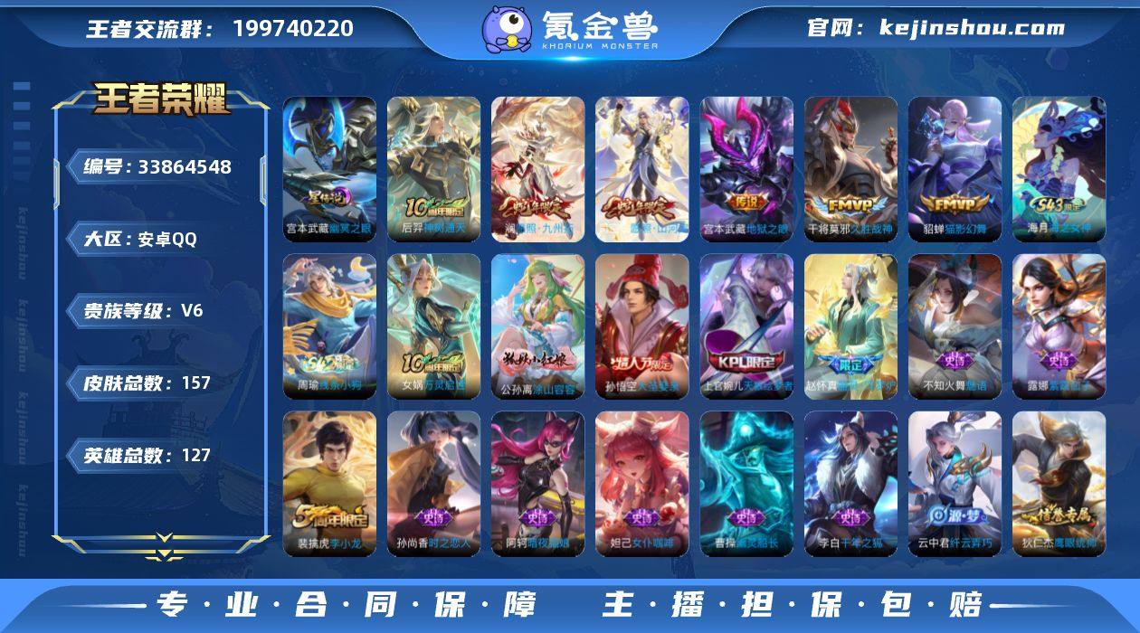 W16425,,可立即换绑无需挂单养号,,铭文满级,,传说6,,,星传说1,,,按键5,,,夺宝211,,安卓Q-V6-永恒钻石IV段位-127英雄-157皮肤-6传说-34史诗 【英雄全皮】:孙权全皮 【传说皮肤】:后羿神树通天,司空震愿照山河定,澜愿照九州拓,貂蝉猫影幻舞,干将莫邪久胜战神,宫本武藏地狱之眼 【限定皮肤】:狄仁杰阴阳师,赵云皇家上将,高渐离玩趣恶龙,阿轲迷踪丽影,芈月重明,吕布猎兽之王,夏侯惇朔风刀,曹操烛龙,狄仁杰魔术师,狄仁杰万华元夜,达摩沙漠行僧,项羽海滩派对,老夫子醍醐杖,程咬金演武夺筹,刘邦夺宝奇兵,孙悟空大圣娶亲,牛魔御旌,李元芳云中旅人,钟馗驱傩正仪,蔡文姬繁星吟游,太乙真人饕餮,鬼谷子原初探秘者,苏烈千军破阵,弈星混沌棋,沈梦溪大漠名商,明世隐疑决卦,裴擒虎李小龙,裴擒虎擒涛扼浪,狂铁御狮,米莱狄御霄,云中君纤云弄巧,盾山御銮,上官婉儿梁祝,上官婉儿天狼绘梦者,鲁班大师探海日志,桑启海盐诗旅,张良古海寻踪,鬼谷子天穹祈灯,刘邦剑破天穹 【年限皮肤】:司空震愿照山河定,澜愿照九州拓 【赛季限定】:太乙真人饕餮,曹操烛龙,芈月重明,狂铁御狮,米莱狄御霄,牛魔御旌,盾山御銮,夏侯惇朔风刀,弈...