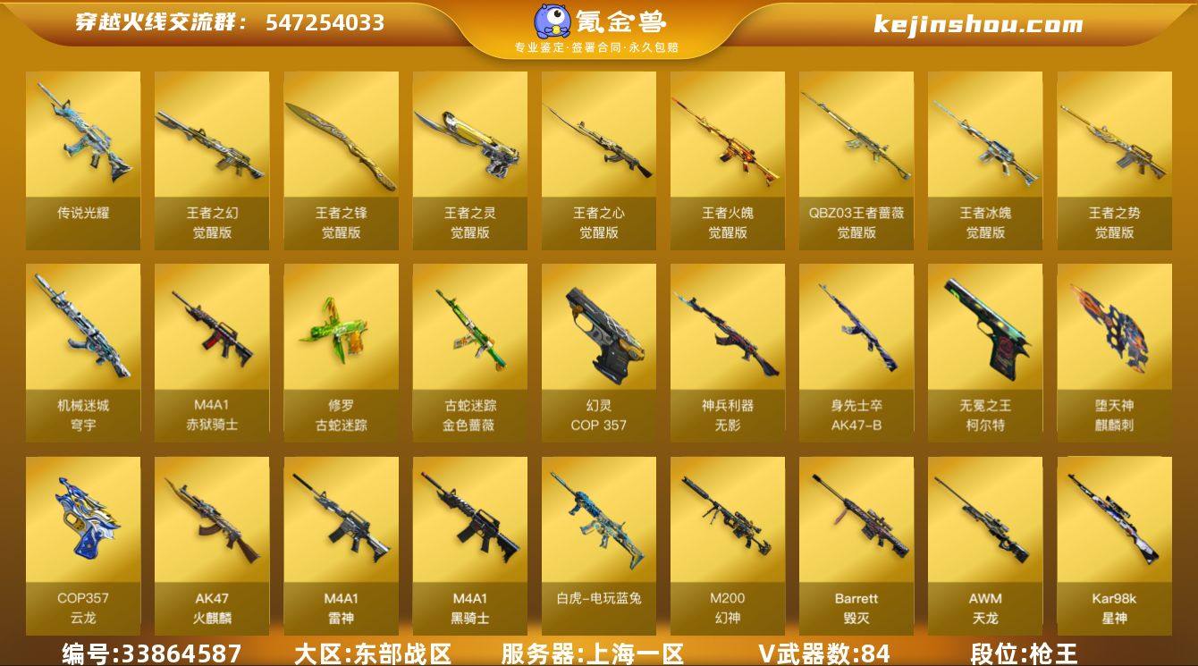 上海一区-97V-8王者武器数-0炫金武器数 【传说武器】:传说光耀 【传说角色】:传说女帝 【热门武器】:传说光耀,QBZ03-金色蔷薇,M200-幻神,金色蔷薇-古蛇迷踪,修罗-古蛇迷踪,M200-竞技荣光,白虎-电玩蓝兔,Kar98K-星神,牛牛-AK47,M4A1-黑骑士*4,汤姆逊-烈龙*6,RPK-盘龙*2,加特林-炼狱,斯泰尔-蝴蝶,雷神-小红,USP-雷暴,COP 357-幻灵,沙鹰-修罗*4,炽芒蝶刃,炽芒蝶刃-荣耀世冠白鲨2023 皮肤,黄金猫猫手套-白鲨,金刚伞,COP 357-极地霜雄 【音效卡】:Kar98K-星神音效卡,屠龙-电竞之星-竞星跃动音效卡,M200-幻神音效卡,M4A1-黑骑士音效卡,Barrett-毁灭音效卡,HK417-朱雀-电竞之星-竞星跃动音效卡,Barrett-碧霄极光音效卡 【皮肤】:幻神-宠儿-2021MVP,幻神-荣耀世冠白鲨2023 皮肤,幻神-电竞之星 皮肤,星神-AG-CFPLS21冠军皮肤,QBZ03-冠军之薇,雷神-暗月,雷神-荣耀之魄,雷神-宠儿-2019MVP,雷神-宇航兔皮肤,雷神-CFS十周年纪念版 皮肤,雷神-源计划2.0专属 皮肤,火麒麟-雷神,AK47-火麒麟-传奇EVEN,火麒麟-平天大圣,火麒麟-白虎,毁灭耀金皮肤,毁灭-CFS2020,毁灭-风暴,毁灭-英雄计划 皮肤,黑龙-能量核心,M4A1-黑龙-361,黑骑士-破浪10...