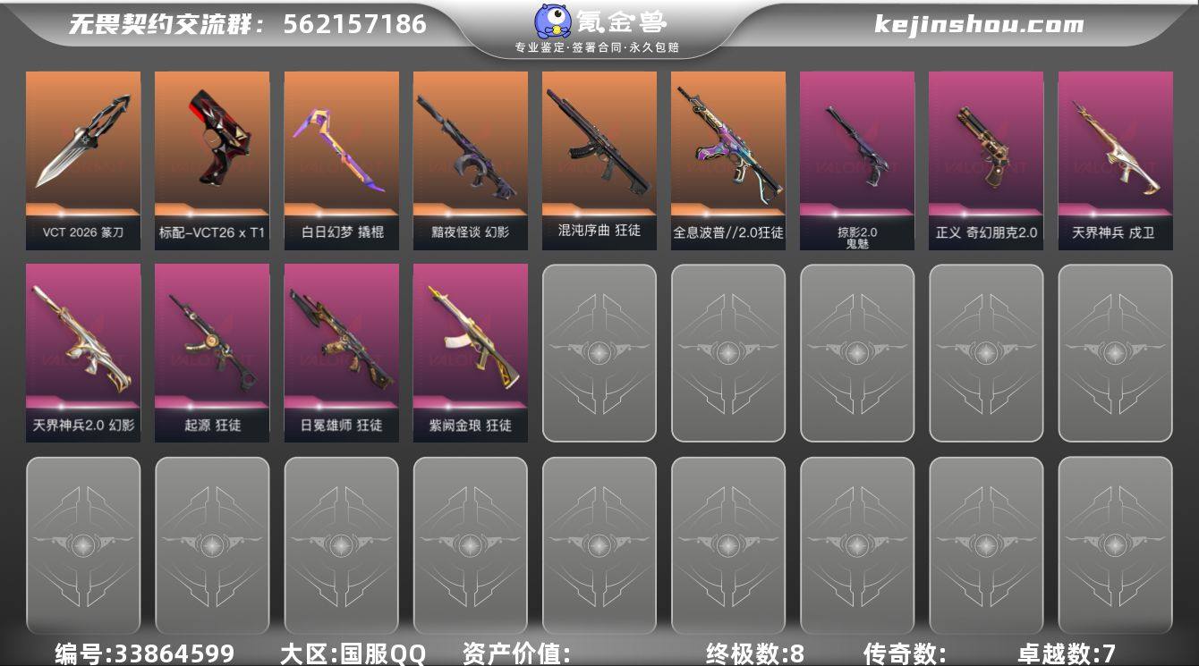 【性价比】w5048 vct26xt1标配 vct26篆刀 暗夜幻影 掠夺2.0鬼魅 波普2.0狂徒 奇幻2,0正义 混沌狂徒 紫金爪刀 天界戍卫 紫金狂徒 天界2.0幻影 日冕狂徒 起源狂徒 库存: 22930 剩余VP:133 剩余R点: 175 段位:铂金2 历史最高:铂金2