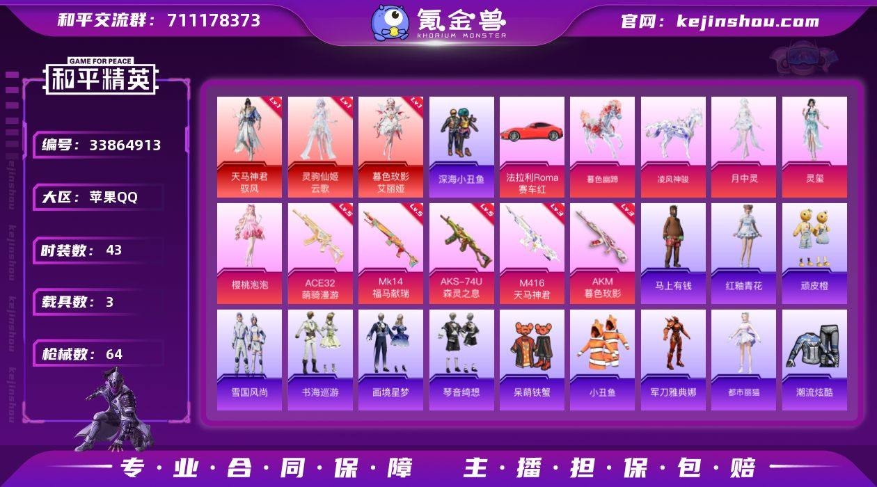 【LHPX1664】【特价出售/店主推荐】/绝世印记1 苹果 手Q-3神装-3粉装-5特效枪-3载具-6粉色飞行器-27161热力值-3王牌印记-43套装-64枪皮【红色神装等级】:天马神君-驭风(一级),灵驹仙姬-云歌(一级),暮色玫影-艾丽娅(一级)【热门品类】:套装-深海小丑鱼,套装-小丑鱼,角色-军刀雅典娜【粉色套装】:角色-樱桃泡泡,角色-灵玺,角色-月中灵【粉色枪皮等级】:AKM-暮色玫影(三级),M416-天马神君(三级),ACE32-萌骑漫游(五级),AKS-74U-森灵之息(五级),Mk14-福马献瑞(五级)【粉色载具】:法拉利Roma(赛车红),暮色幽蹄,凌风神骏【粉色枪皮】:AKM-暮色玫影,M416-天马神君,ACE32-萌骑漫游,AKS-74U-森灵之息,Mk14-福马献瑞【粉色飞行器】:香车宝马飞行器,炫彩糖果飞行器,极意拳锋飞行器,暮色之舞飞行器,踏卷乘风飞行器