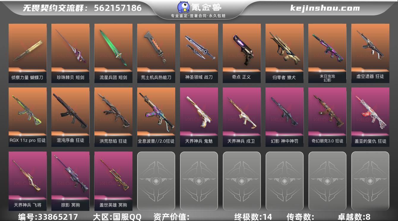 L3471 【精品号】奇点正义 天界飞将 全息2.0狂徒 末日幻影 奇幻3.0狂徒 显卡狂徒 掠影冥驹 神中幻影 虚空狂徒 紫金爪刀 天界戍卫 天界鬼魅 混沌狂徒 盖世冥驹 侦查蝴蝶刀 归零獠犬 盖亚狂徒 洪荒狂徒 库存: 28200剩余VP:17剩余R点: 325段位:超凡3历史最高:超凡3