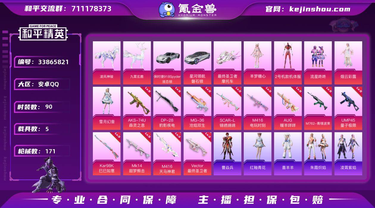 【kyhp1256】安卓 手Q-5粉装-12特效枪-5载具-6粉色飞行器-61127热力值-4王牌印记-90套装-171枪皮 【热门品类】:套装-龟仙人,套装-粉红小猪 【粉色套装】:角色-2号机款机体服,粉装-流星咚咚,角色-烟云彩露,粉装-雪月幻音,角色-羊梦糖心 【粉色枪皮等级】:SCAR-L-锦绣绵绵(五级),M416-电玩时刻(五级),M416-天马神君(三级),AUG-暖羊咩咩(五级),M762-青锋波束(五级),UMP45-量子极限(五级),Vector-最终圣卫者(三级),AKS-74U-森灵之息(五级),Kar98K-巳巳如意(五级),Mk14-甜梦熊击(五级),DP-28-豹影疾电(五级),MG-36-沧焰双生(五级) 【粉色载具】:星河领航(磐石银),保时捷918 Spyder(液态银),最终圣卫者摩托车,僚机-圣域龙宝,凌风神骏,九霄玄鹿 【粉色枪皮】:SCAR-L-锦绣绵绵,M416-电玩时刻,M416-天马神君,AUG-暖羊咩咩,M762-青锋波束,UMP45-量子极限,Vector-最终圣卫者,AKS-74U-森灵之息,Kar98K-巳巳如意,Mk14-甜梦熊击,DP-28-豹影疾电,MG-36-沧焰双生 【粉色飞行器】:凤舞九天飞行器,圣域金龙飞行器,终晖之翼飞行器,飞天猪飞行器,踏卷乘风飞行器,云梦轻舟飞行器 【粉色降落伞】:极限特训降落伞,星之彼岸降落伞,海渊国主降落伞,...