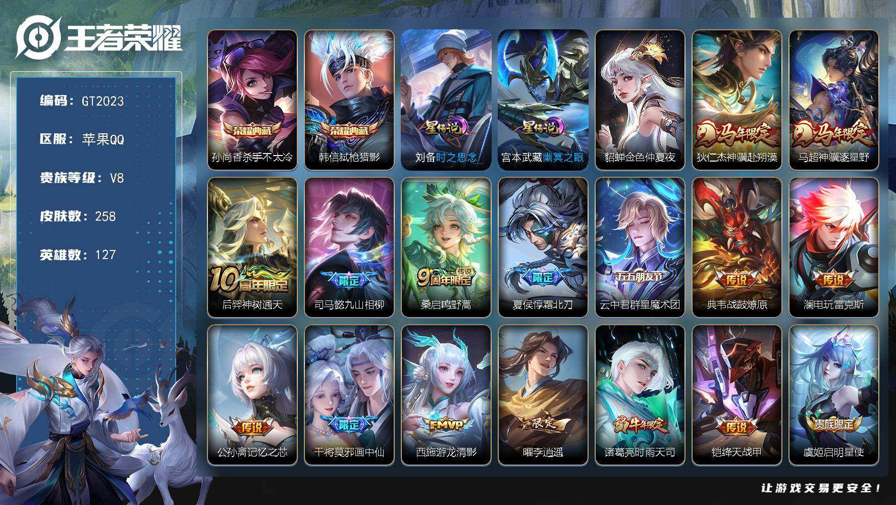 2579839-可换绑 【精品号·典藏韩信孙尚香·马年狄仁杰马超·李逍遥·时雨天司·白虎志·武陵仙君·神威·】18按键,3星传说,16王者印记,五级铭文250,无二次,苹果Q-V8-258皮肤-2典藏皮肤-23传说-79史诗【英雄全皮】:孙权全皮【荣耀典藏】:孙尚香杀手不太冷,韩信弑枪猎影【星元皮肤】:貂蝉金色仲夏夜,宫本武藏幽冥之眼,刘备时之思念【传说皮肤】:狄仁杰神骥赴朔漠,马超神骥逐星野,后羿神树通天,司马懿九山相柳,桑启鸣野蒿,夏侯惇霜北刀,云中君群星魔术团,典韦战鼓燎原,澜电玩雷克斯,公孙离记忆之芯,干将莫邪画中仙,西施游龙清影,曜李逍遥 ,诸葛亮时雨天司,铠绛天战甲,虞姬启明星使,李信一念神魔,刘备时之恋人,虞姬云霓雀翎,百里玄策白虎志,诸葛亮武陵仙君,貂蝉仲夏夜之梦,宫本武藏地狱之眼【限定皮肤】:夏侯惇霜北刀,蒙犽顽岩魄,蔡文姬夏日便利店,虞姬夏日便利店,姜子牙天穹之誓,狄仁杰阴阳师,赵云皇家上将,高渐离死亡摇滚,高渐离玩趣恶龙,周瑜赤莲之焰,元歌云间偶戏,元歌无心,夏侯惇朔风刀,甄姬游园惊梦,马可波罗暗影游猎,狄仁杰魔术师,狄仁杰万华元夜,达摩沙漠行僧,项羽海滩派对,老夫子醍醐杖,程咬金演武夺筹,兰陵王驯魔猎人...