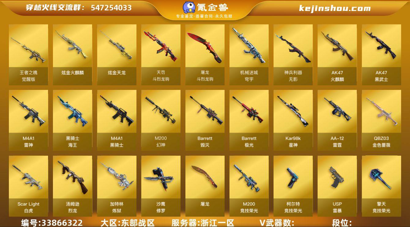 东部战区(浙江一区)ys【精美生化爆破号】50v【M200-幻神,Kar98k-星神,竞技荣光套装,QBZ03-金色蔷薇+皮/量子蔷薇,ScarLight-白虎,6烈龙+斯泰尔-蝴蝶,COP-雷暴,柯尔特-竞技荣光,猫猫手套,胡萝卜匕首】1王者【王者之魄】2炫金【炫金天龙,炫金火麒麟】4角色【四防电竞教官-云悠悠,修道士,魅影,雪域霜狐】1音效 【M4A1-黑骑士音效卡】23皮【金色蔷薇-量子蔷薇,龙啸-纸灯龙,黑骑士-摸金校尉,雷神-源计划2.0,黑骑士-CFS2021,屠龙-破浪逐光,修罗-CFS2018,毁灭-CFS2018,火麒麟-平天大圣,毁灭-黑大圣,雷神-CFS 2019,火麒麟-华夏之心,黑武士-典韦,火麒麟-雷神,火麒麟-心动糖果】VIP5截图展示段位不代表实际段位 如赛季更新等不可抗拒因素发生变化、时限道具不保证所剩时间
