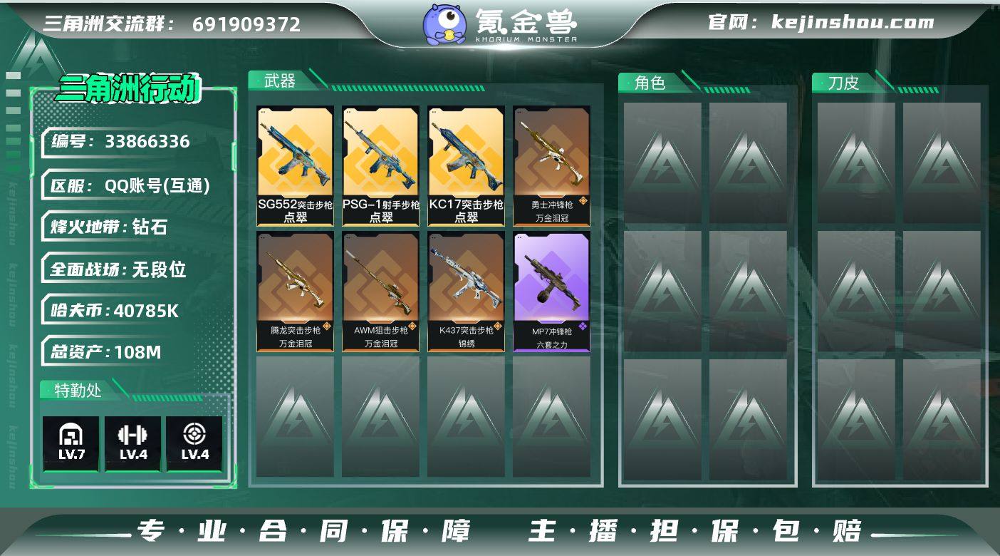 【LSJX986】108m总资产-40785k哈夫币-60烽火等级-钻石-1战场等级-无军衔 【近战皮肤】:近战-黑鹰 【传说外观】:SG552突击步枪-点翠,腾龙突击步枪-万金泪冠,K437突击步枪-锦绣,KC17突击步枪-点翠,勇士冲锋枪-万金泪冠,PSG-1射手步枪-点翠,AWM狙击步枪-万金泪冠 【史诗外观】:MP7冲锋枪-六套之力,QJB201轻机枪-炽焰 【稀有外观】:SG552突击步枪-贴花艺术, AK-12突击步枪-马年新春,SMG-45冲锋枪-行动开启 【普通外观】:SG552突击步枪-浅蓝涂装,M1014霰弹枪-重击,杠杆式步枪-出货,QJB201轻机枪-典雅,QJB201轻机枪-玲珑,SR9射手步枪-出货 【挂饰】:挂饰-福禄,挂饰-聚宝盆,挂饰-万金泪冠,挂饰-点翠,挂饰-麻将*9,挂饰-星象仪