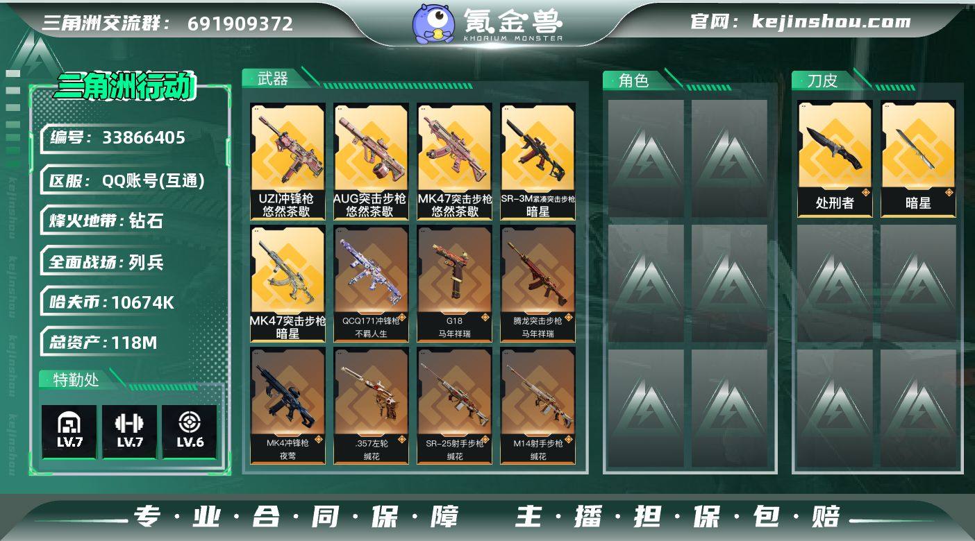 【PTSJZ4522】总资产118M/哈夫币1067万/传说近战数1/传说枪皮数17/战场等级27/行动等级60/安全箱等时效性道具以游戏内数据为准,详情请看图/近战-暗星/近战-处刑者/近战-黑鹰/AKM突击步枪-锦绣/AUG突击步枪-悠然茶歇/腾龙突击步枪-马年祥瑞/K437突击步枪-锦绣/MK47突击步枪-悠然茶歇/MK47突击步枪-暗星/UZI冲锋枪-悠然茶歇/SMG-45冲锋枪-锦绣/SR-3M紧凑突击步枪-暗星/QCQ171冲锋枪-不羁人生/MK4冲锋枪-夜莺/M14射手步枪-蛮荒/M14射手步枪-缄花/SKS射手步枪-骑士/SR-25射手步枪-缄花/.357左轮-缄花/G18-马年祥瑞/SVD狙击步枪-檀劫铳影/K416突击步枪-冬日风情/K416突击步枪-腊梅/SCAR-H战斗步枪-囚徒/G3战斗步枪-哈夫克警备/K437突击步枪-丛林谍踪/MP5冲锋枪-竞技风/SR-3M紧凑突击步枪-开工大吉/勇士冲锋枪-丛林谍踪/MP7冲锋枪-六套之力/PKM通用机枪-阿萨拉特攻/M249轻机枪-丛林谍踪/M250通用机枪-囚徒/QJB201轻机枪-炽焰/VSS射手步枪-丛林谍踪/野牛冲锋枪-千里骏骨/AKM突击步枪-肃杀/K416突击步枪-一帆风顺/SG552突击步枪-2026/SG552突击步枪-马年新春/SG552突击步枪-贴花艺术/ AK-12突击步枪-马年新春/SCAR-H战斗步枪-荣耀列队/CAR-15突击步枪-来财/KC17突击步枪-来财/Vector...