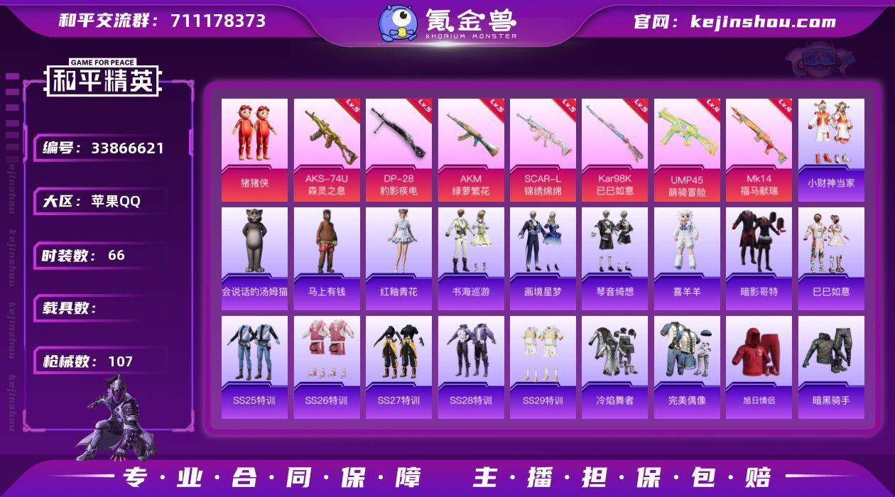 苹果 手Q-1粉装-7特效枪-0载具-1粉色飞行器-28995热力值-4王牌印记-66套装-107枪皮 【热门品类】:套装-暗影哥特 【粉色套装】:玩偶服-猪猪侠 【粉色枪皮等级】:AKM-绿萝繁花(五级),SCAR-L-锦绣绵绵(五级),UMP45-萌骑冒险(四级),AKS-74U-森灵之息(五级),Kar98K-巳巳如意(五级),Mk14-福马献瑞(四级),DP-28-豹影疾电(五级) 【粉色枪皮】:AKM-绿萝繁花,SCAR-L-锦绣绵绵,UMP45-萌骑冒险,AKS-74U-森灵之息,Kar98K-巳巳如意,Mk14-福马献瑞,DP-28-豹影疾电 【粉色飞行器】:炫彩糖果飞行器 【粉色降落伞】:星穹咏叹调降落伞,异瞳寒姬降落伞,极意拳锋降落伞 【稀有套装】:套装-巳巳如意,套装-小财神当家,套装-马上有钱,玩偶服-喜羊羊,套装-书海巡游,套装-画境星梦,套装-琴音绮想,套装-雨过天青,套装-红釉青花,玩偶服-会说话的汤姆猫 【稀有枪皮】:AKM-霓虹街区,AKM-龙的传人,M16A4-幻世战舞者,M16A4-绒绒猫尾,SCAR-L-炫彩节奏,SCAR-L-玉兔迎春,SCAR-L-粉锦千层,M416-糯团青竹,M416-红色方程式,AUG-青春冒险家,QBZ-彩虹符号,M762-天降萌叽,M762-彩虹符号,M762-登顶巅峰,AC-VAL-快闪甜心,ACE32-画境星梦,UZI-啾咪啾咪,UMP45-猪猪侠,汤姆...