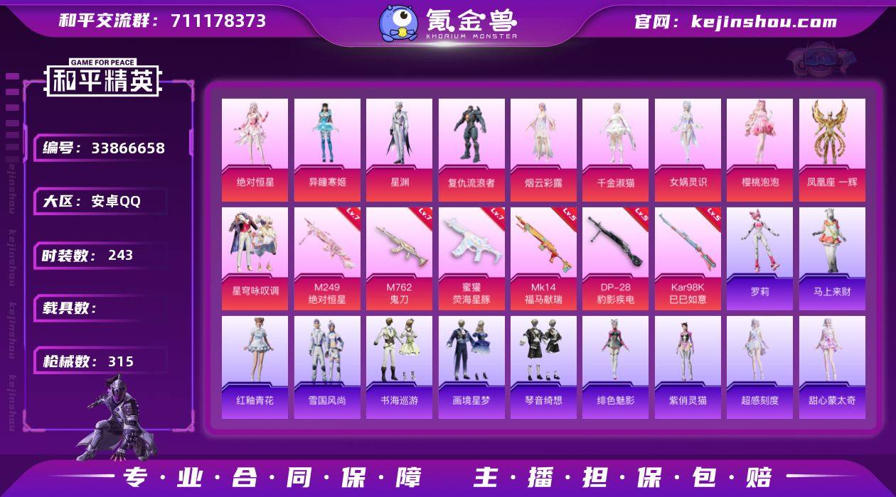 安卓 手Q-无敌战神框-10粉装-6特效枪-0载具-6粉色飞行器-99065热力值-19王牌印记-243套装-315枪皮 【热门品类】:套装-龟仙人,套装-暗影哥特,套装-粉红小猪,角色-Mark.06,熔岩游骑兵连帽夹克 【粉色套装】:角色-绝对恒星,角色-复仇流浪者,角色-烟云彩露,角色-千金淑猫,角色-女娲灵识,角色-樱桃泡泡,角色-凤凰座 一辉,粉装-星穹咏叹调,角色-星渊,角色-异瞳寒姬 【粉色枪皮等级】:M762-鬼刀(七级),蜜獾-荧海星豚(七级),Kar98K-巳巳如意(五级),Mk14-福马献瑞(五级),M249-绝对恒星(七级),DP-28-豹影疾电(五级) 【粉色枪皮】:M762-鬼刀,蜜獾-荧海星豚,Kar98K-巳巳如意,Mk14-福马献瑞,M249-绝对恒星,DP-28-豹影疾电 【粉色飞行器】:绝对恒星飞行器,炫彩糖果飞行器,夜幕颂歌飞行器,霓虹漫游飞行器,英伦信使飞行器,彩虹独角兽飞行器 【粉色降落伞】:绝对恒星降落伞,环太平洋降落伞,垂柳戏鸭降落伞,第五大道降落伞,圣堂之誓降落伞,蜜语绒猫降落伞,绝色倾城降落伞,精灵梦叶罗丽降落伞,忍者神龟降落伞,千金淑猫降落伞,鬼刀降落伞,晶梦幻蝶降落伞,月下星之子降落伞,桃粉嫣然降落伞,雪月幻音降落伞,智耀战神降落伞,星穹咏叹调降落伞,绯...