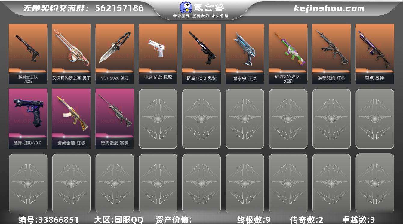 【套装】:VCT 2026 赛季套装 【英雄】:炼狱,暮蝶,壹决,铁臂,捷风,雷兹,不死鸟,贤者,猎枭,芮娜,奇乐,尚勃勒,斯凯,K/O,盖可,黑梦 【近战武器】:近战武器-蒙太奇 战斧,近战武器-碎心裂刃,近战武器-VCT 2026 篆刀 【狂徒】:狂徒-洪荒怒焰,狂徒-紫阙金琅 【幻影】:幻影-砰砰X特攻队,幻影-蒙太奇 【冥驹】:冥驹-堕天遗武 【战神】:战神-奇点,战神-蒙太奇 【奥丁】:奥丁-艾沃莉的梦之翼 【骇灵】:骇灵-蒙太奇 【追猎】:追猎-掠影//3.0 【标配】:标配-电音光谱,标配-电音光谱 【正义】:正义-塑水宗 【鬼魅】:鬼魅-奇点//2.0,鬼魅-超时空卫队 【狂怒】:狂怒-蒙太奇 【卡面】:悠享食光 卡面,无畏契约GO!第一卷:芮娜 卡面,无畏契约GO!第一卷:零 卡面,《双城之战》金克丝 卡面,代号红色 卡面,新兵报到 卡面,V契约 卡面,无畏契约 卡面 【喷漆】:审判之爪 喷漆,霓光四射 喷漆,买装还是存钱 喷漆,关门放狗 喷漆,红鳞 喷漆,暴走萝莉 喷漆,松叶 喷漆,无畏契约GO!第一卷:奇乐 喷漆,放下武器 喷漆,胜利属于无畏契约 喷漆,GLHF 喷漆,无畏契约 喷漆 【挂饰】:无畏契约GO!第一卷 零 挂饰,瞬云履 挂饰,改变者全球冠军赛奖杯 挂饰...