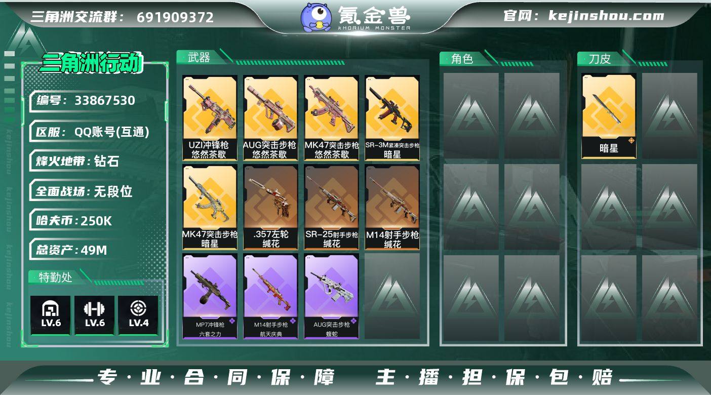 【PTSJZ4382】总资产49M/哈夫币25万/传说近战数1/传说枪皮数8/战场等级2/行动等级55/安全箱等时效性道具以游戏内数据为准,详情请看图/近战-暗星/近战-黑鹰/AUG突击步枪-悠然茶歇/MK47突击步枪-悠然茶歇/MK47突击步枪-暗星/UZI冲锋枪-悠然茶歇/SR-3M紧凑突击步枪-暗星/M14射手步枪-缄花/SR-25射手步枪-缄花/.357左轮-缄花/AUG突击步枪-蝮蛇/MP7冲锋枪-六套之力/QJB201轻机枪-炽焰/M14射手步枪-航天庆典/SG552突击步枪-贴花艺术/ AK-12突击步枪-马年新春/SMG-45冲锋枪-行动开启/QJB201轻机枪-哈夫克卫队/QSZ92G-一帆风顺/M4A1突击步枪-粉色涂装/QBZ95-1突击步枪-高雅黑/QBZ95-1突击步枪-海色/AUG突击步枪-浅蓝涂装/SG552突击步枪-狂欢/SCAR-H战斗步枪-数码迷彩/CAR-15突击步枪-狂欢/MP5冲锋枪-黄蜂/UZI冲锋枪-狂欢/M1014霰弹枪-海浪/M1014霰弹枪-重击/M249轻机枪-黄蜂/QJB201轻机枪-典雅/SR-25射手步枪-黄蜂/SR-25射手步枪-黑巧甜心/沙漠之鹰-高雅黑/挂饰-暗星/挂饰-北非蛋/挂饰-缄花/挂饰-悠然茶歇