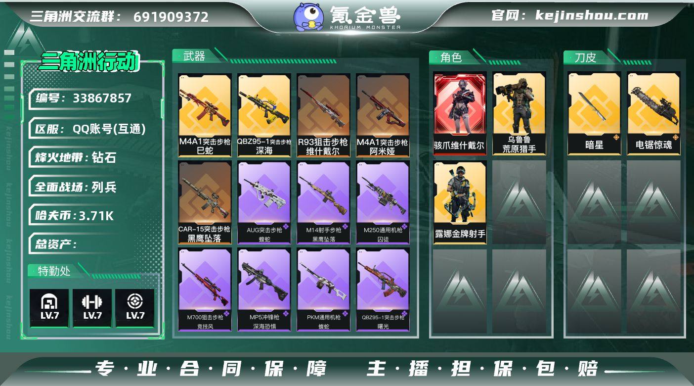 【暗星 电锯惊魂 红皮骇爪 S8赛季高级安全箱 5颗AW子弹 总资产124M,哈夫币3,719K,行动等级:60,近战数量:2,干员红皮数量:1,仓库等级:7级,训练中心等级:7级,靶场等级:7级,干员皮肤:3,枪皮:173 秒换绑不用等】 【近战武器】 近战-电锯惊魂 近战-暗星 黑鹰 【干员皮肤】 骇爪-维什戴尔 乌鲁鲁-荒原猎手 露娜-金牌射手 【传说挂饰】 维什戴尔 蚀金玫瑰 祥龙 【其他典藏】 MP5冲锋枪-古铜 UZI冲锋枪-旧梦 QCQ171冲锋枪-地平线 M249轻机枪-古铜 G17-古铜 AKM突击步枪-噬菌体 【枪皮】 M4A1突击步枪-高雅黑 QBZ95-1突击步枪-高雅黑 G3战斗步枪-高雅黑 QBZ95-1突击步枪-曙光 M4A1突击步枪-海色 QBZ95-1突击步枪-海色 AUG突击步枪-蝮蛇 SCAR-H战斗步枪-荣耀列队 PTR-32突击步枪-黄蜂 M4A1突击步枪-阿米娅 SG552突击步枪-海浪 QBZ95-1突击步枪-海浪 SCAR-H战斗步枪-数码迷彩 M4A1突击步枪-粉色涂装 SCAR-H战斗步枪-红色涂装 M7战斗步枪-红色涂装 AUG突击步枪-浅蓝涂装 SG552突击步枪-浅蓝涂装 K416突击步枪-几何迷彩 K416突击步枪-高雅黑 M700狙击步枪-竞技风 SVD狙击步枪-阿萨拉工艺 SV-98狙击步枪-星链科技 SV-98狙击步枪-红色涂装 SR-25射手步枪-开拓 SKS射手步枪-弄臣 Mini-...