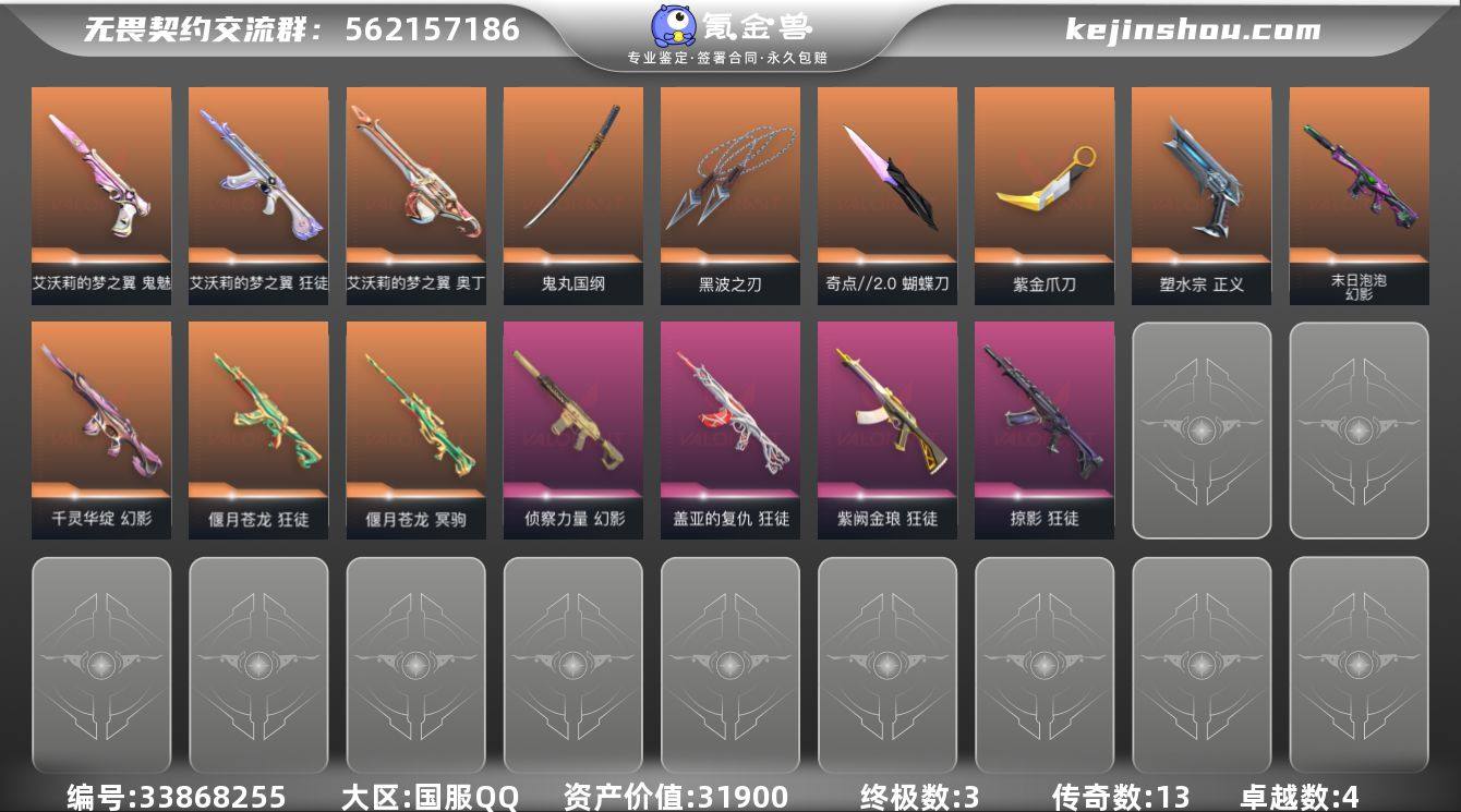 段位: 青铜 近战武器皮肤: 紫金爪刀-紫阙金琅//2.0,黑波之刃-塑水宗,蝴蝶刀-奇点//2.0,鬼丸国纲-般若假面//2.0 步枪皮肤: 狂徒-紫阙金琅,狂徒-盖亚的复仇,狂徒-偃月苍龙,幻影-侦察力量,幻影-千灵华绽,狂徒-艾沃莉的梦之翼,狂徒-掠影,幻影-末日泡泡 佩枪皮肤: 正义-塑水宗,鬼魅-艾沃莉的梦之翼 狙击枪皮肤: 冥驹-偃月苍龙 机枪皮肤: 奥丁-艾沃莉的梦之翼 亮点: 【充值总皮肤】: 紫金爪刀, 末日泡泡 幻影, 艾沃莉的梦之翼 鬼魅, 黑波之刃, 偃月苍龙 冥驹, 奇点//2.0 蝴蝶刀, 塑水宗 正义, 侦察力量 幻影, 艾沃莉的梦之翼 狂徒, 艾沃莉的梦之翼 奥丁, 鬼丸国纲, 盖亚的复仇 狂徒, 掠影 狂徒, 偃月苍龙 狂徒, 千灵华绽 幻影, 紫阙金琅 狂徒