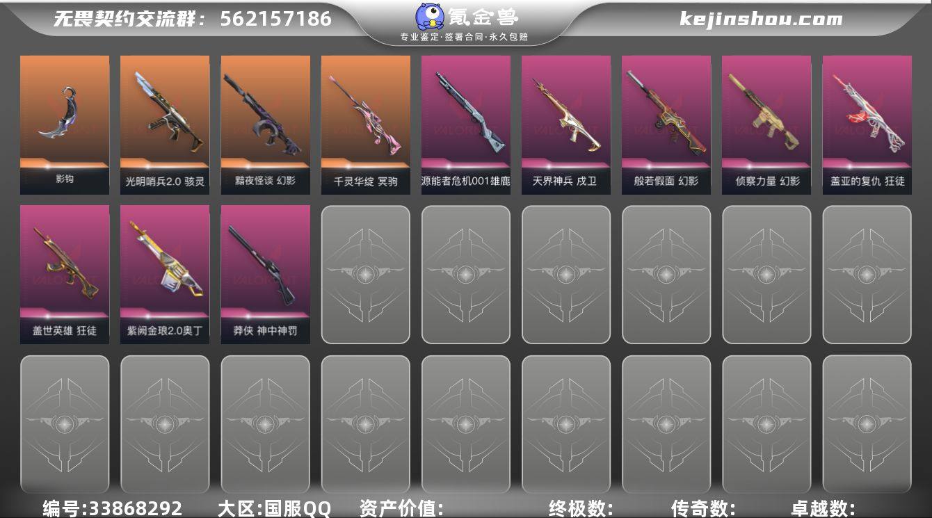 【wwxb969】LV等级154/皮肤总价值39530/段位白银/总皮肤数量77/刀皮数量6/枪皮数量71/套装数量1/具体详情请看图/VCT 2026 赛季套装/幻棱/炼狱/维斯/暮蝶/钛狐/壹决/铁臂/捷风/雷兹/幽影/不死鸟/贤者/猎枭/蝰蛇/零/芮娜/奇乐/尚勃勒/霓虹/斯凯/夜露/星礈/K/O/海神/盖可/黑梦/钢锁/近战武器-蒙太奇 战斧/近战武器-碎心裂刃/近战武器-VCT 2026 篆刀/影钩/近战武器-澄湖潋滟/星际猎兵-短剑/2025全球冠军赛-狂徒/狂徒-盖世英雄/狂徒-盖亚的复仇/幻影-黯夜怪谈/末日泡泡 幻影/幻影-ORA x 颗秒/幻影-般若假面/幻影-侦察力量/幻影-蒙太奇/戍卫-天界神兵/冥驹-千灵华绽/莽侠-神中神罚/战神-蒙太奇/奥丁-紫阙金琅2.0/上古龙炎 判官/雄鹿-源能者危机001/骇灵-光明哨兵2.0/骇灵-蒙太奇/海洋之星//2.0-标配/追猎-掠影//3.0/标配-VCT26 x AG/末日泡泡-正义/噬影者-鬼魅/天界神兵-鬼魅/鬼魅-灵魂消声者/狂怒-蒙太奇/铁之华 卡面/无畏契约GO!第一卷:芮娜 卡面/无畏契约GO!第一卷:零 卡面/《双城之战》金克丝 卡面/代号红色 卡面/新兵报到 卡面/V契约 卡面/无畏契约 卡面/高丽风情小蛙 喷漆/审判之爪 喷漆/买装还是存钱 喷漆/省钱大师 喷漆 /放下武器 喷漆/胜利属于无畏契约 喷漆/GLHF 喷漆...