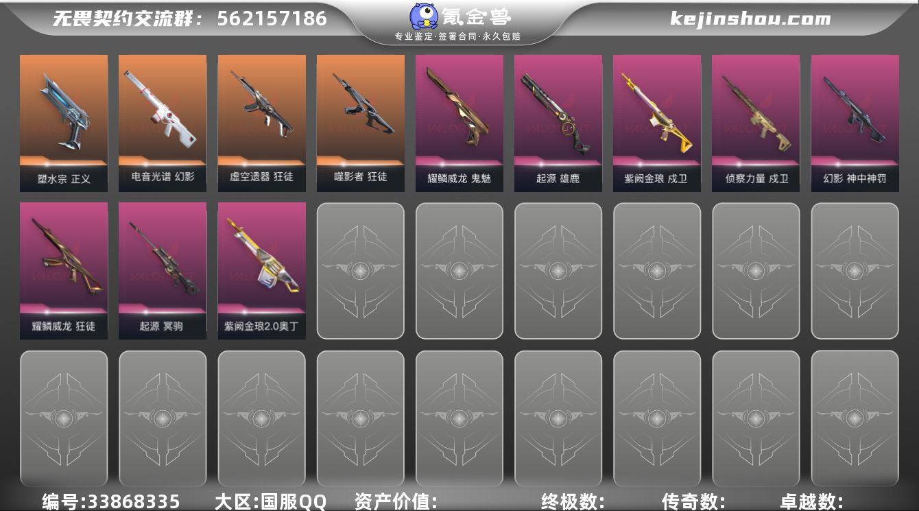 【wwxb967】LV等级147/皮肤总价值39550/段位白银/总皮肤数量95/刀皮数量8/枪皮数量87/套装数量3/具体详情请看图/VCT 2026 赛季套装/VCT 2025 赛季套装/耀鳞威龙/幻棱/炼狱/维斯/暮蝶/钛狐/壹决/铁臂/捷风/雷兹/幽影/不死鸟/贤者/猎枭/蝰蛇/零/芮娜/奇乐/尚勃勒/霓虹/斯凯/夜露/星礈/K/O/海神/盖可/黑梦/钢锁/近战武器-蒙太奇 战斧/近战武器-VCT 2026 篆刀/近战武器-VCT2025爪刀/近战武器-镭切/近战武器-威龙之刃/近战武器-诡秘蛇影军刀/近战武器-日耀风暴遗器/近战武器-阿特拉斯指挥部 甩棍/狂徒-创纪元/狂徒-虚空遗器/狂徒-噬影者/狂徒-多弥尔的复仇/狂徒-耀鳞威龙/狂徒-诡秘蛇影/幻影-电音光谱/幻影-神中神罚/幻影-蒙太奇/幻影-末日之翼/戍卫-侦察力量/戍卫-紫阙金琅/戍卫-折光棱晶/冥驹-起源/飞将-末日之翼/莽侠-诡秘蛇影/战神-蒙太奇/奥丁-紫阙金琅2.0/奥丁-末日之翼/判官-诡秘蛇影/雄鹿-起源/骇灵-蒙太奇/蜂刺-折光棱晶/标配-折光棱晶/正义-塑水宗/西部未来-正义/正义-ORA x 颗秒/正义-纳米打击/天界神兵-鬼魅/鬼魅-耀鳞威龙/鬼魅-诡秘蛇影/鬼魅-星云暗涌/狂怒-蒙太奇/短炮-末日之翼/终章:激斗汉堡 卡面/进入射程 卡面/《双城之战》拥抱 卡面/精灵大战 卡面/欢迎来到底...