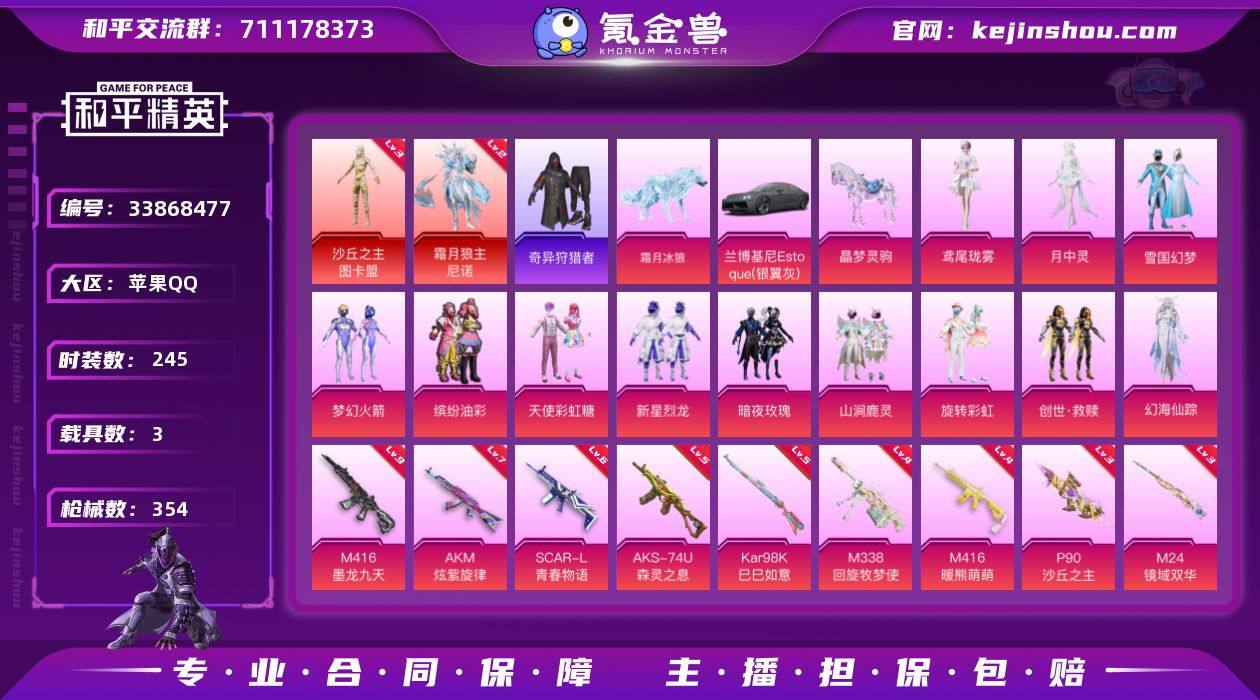 【LHPD835】带1258点券【特价出售/店主推荐】苹果 手Q-2神装-12粉装-11特效枪-3载具-6粉色飞行器-118863热力值-26王牌印记-245套装-354枪皮 【红色神装等级】:霜月狼主-尼诺(二级),沙丘之主-图卡盟(三级) 【红色角色神装】:霜月狼主-尼诺,沙丘之主-图卡盟 【热门品类】:粉装-雪国幻梦,粉装-梦幻火箭,粉装-缤纷油彩,套装-奇异狩猎者,套装-金羽特工,套装-暗夜行者,套装-SS1特训,套装-龟仙人,套装-暗影哥特,套装-粉红小猪,角色-Mark.06,熔岩游骑兵连帽夹克 【粉色套装】:粉装-天使彩虹糖,粉装-雪国幻梦,粉装-梦幻火箭,粉装-缤纷油彩,粉装-新星烈龙,粉装-暗夜玫瑰,粉装-山涧鹿灵,粉装-旋转彩虹,套装-创世·救赎,角色-幻海仙踪,角色-月中灵,角色-鸢尾珑雾 【粉色枪皮等级】:UMP45-霜月狼主(二级),AKM-炫紫旋律(七级),SCAR-L-青春物语(六级),M416-暖熊萌萌(四级),M416-墨龙九天(九级),AKS-74U-森灵之息(五级),P90-沙丘之主(三级),Kar98K-巳巳如意(五级),M24-镜域双华(三级),M338-回旋牧梦使(四级) 【粉色载具】:兰博基尼Estoque(银翼灰),晶梦灵驹,霜月冰狼 【粉色枪皮】:AKM-炫紫旋律,SCAR-L-青春物语,M416-暖熊萌萌,M416-墨龙九天,...