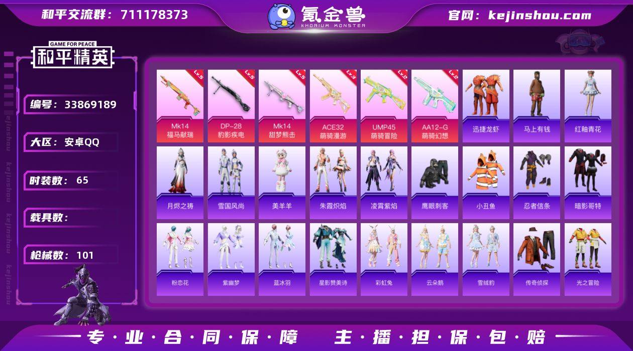 安卓 手Q-0粉装-6特效枪-0载具-1粉色飞行器-21470热力值-1王牌印记-65套装-101枪皮 【热门品类】:套装-小丑鱼,套装-忍者信条,套装-暗影哥特 【粉色枪皮等级】:ACE32-萌骑漫游(三级),UMP45-萌骑冒险(二级),Mk14-甜梦熊击(五级),Mk14-福马献瑞(五级),AA12-G-萌骑幻想(二级),DP-28-豹影疾电(五级) 【粉色枪皮】:ACE32-萌骑漫游,UMP45-萌骑冒险,Mk14-甜梦熊击,Mk14-福马献瑞,AA12-G-萌骑幻想,DP-28-豹影疾电 【粉色飞行器】:炫彩糖果飞行器 【粉色降落伞】:极意拳锋降落伞,炫彩糖果降落伞,罪夜之冕降落伞 【稀有套装】:套装-雪国风尚,套装-炫彩糖果,套装-马上有钱,套装-迅捷龙虾,套装-粉恋花,套装-紫幽梦,套装-蓝冰羽,套装-星影赞美诗,套装-彩虹兔,套装-云朵鹅,套装-雪绒豹,套装-朱霞炽焰,套装-凌霄紫焰,玩偶服-美羊羊,角色-月烬之祷,套装-雨过天青,套装-红釉青花 【稀有枪皮】:AUG-冰晶雪宝,M16A4-红色方程式,SCAR-L-夜灯,M416-红色方程式,M416-蓝色火焰,AUG-耀粉歌者,AUG-青春冒险家,M762-云朵鹅,Mk47-洛神天依,蜜獾-天降萌叽,ARX-凌霄紫焰,UZI-啾咪啾咪,UMP45-夜灯,汤姆逊-天降萌叽,汤姆逊-炫彩节奏,汤姆逊-像素花束,JS9...